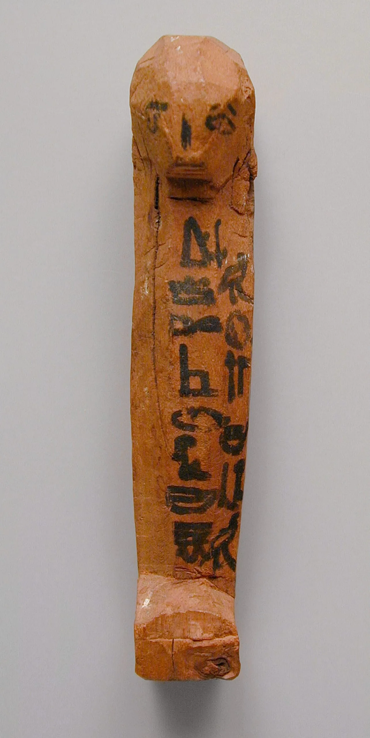 Small ancient Egyptian mummy-form figure in orange-tan pigmented wood or gesso, with a column of black hieroglyphic text painted down the front