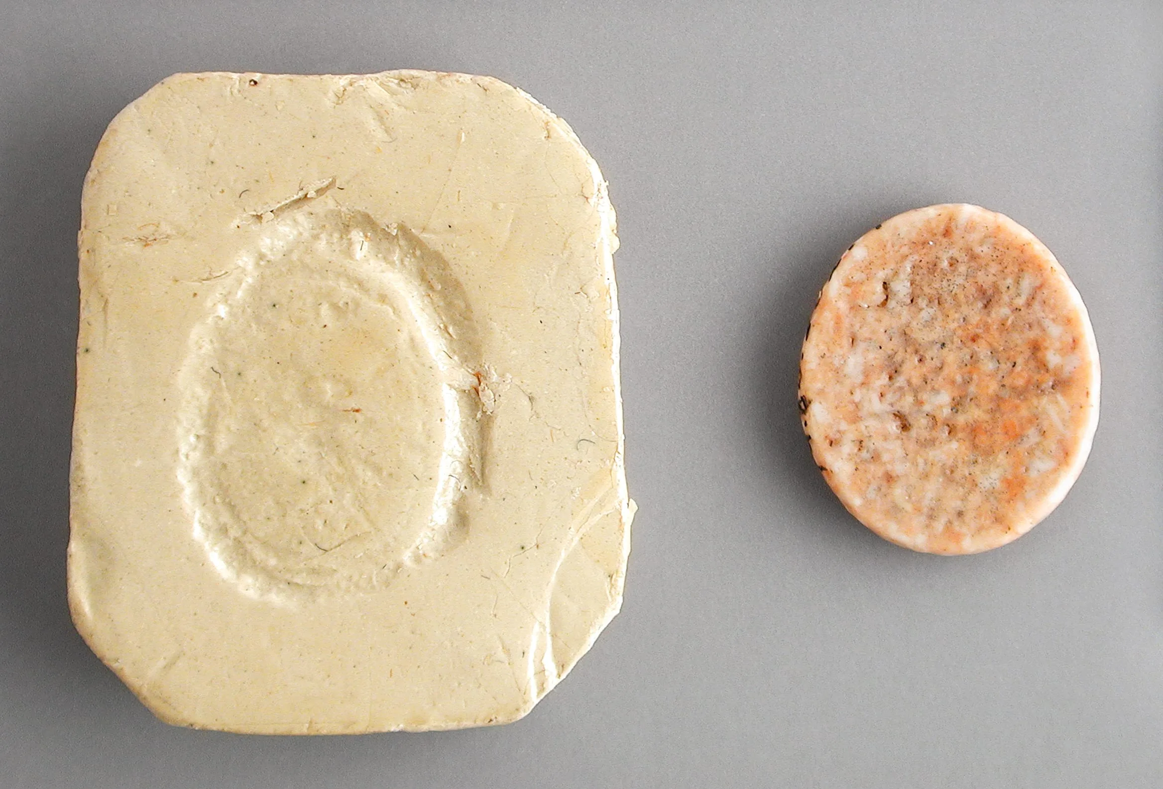 Two small objects on a gray surface: a cream-yellow rectangular block with a shallow oval impression and a mottled terracotta and ivory circular disc