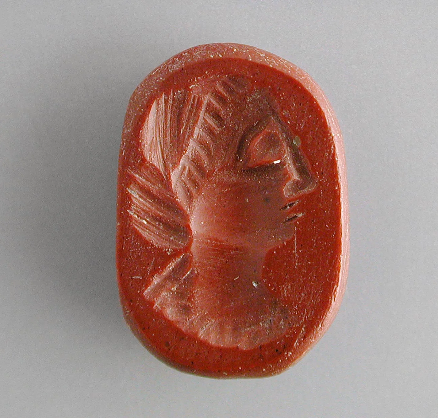 Small oval carnelian intaglio gem with a profile bust in relief, depicting a helmeted figure, deep brick-red stone with incised carving