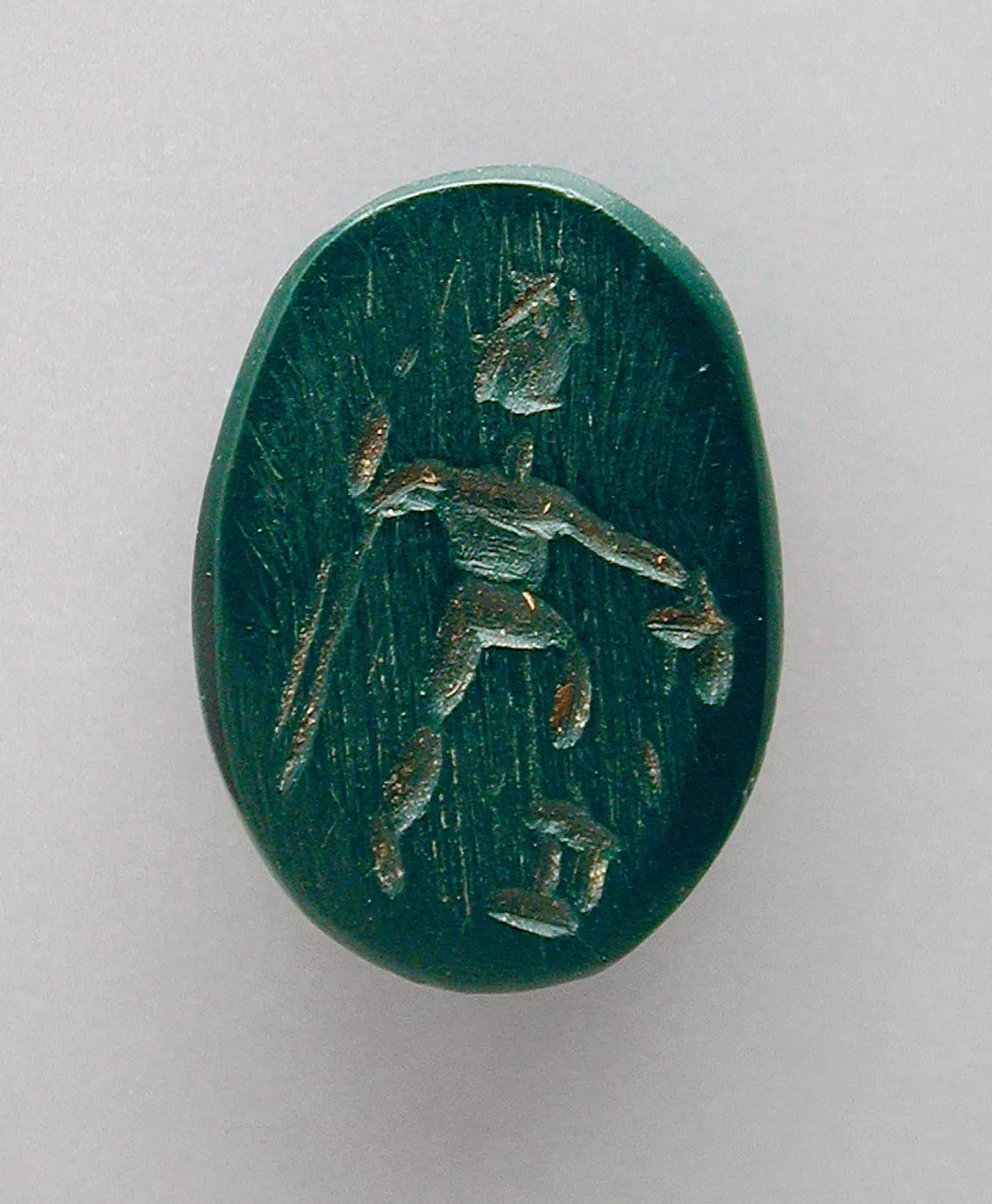 Small oval intaglio gem in deep teal-green stone, carved with a striding male figure in winged helmet, arms outstretched, holding a small object