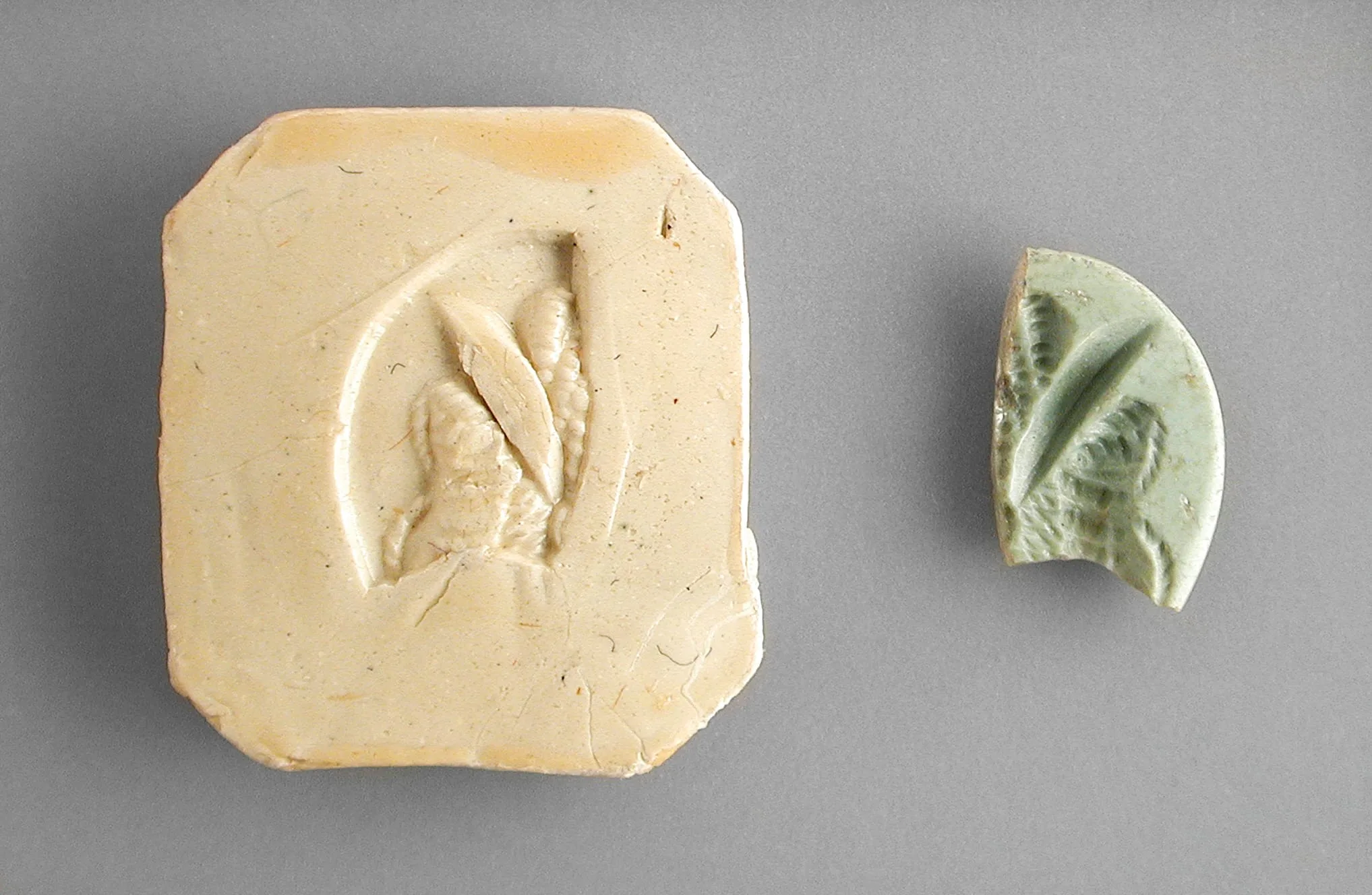 Ceramic press mold and partial cast: a cream-colored square mold with an intaglio leaf design, alongside a smaller sage-green half-moon shaped cast with raised leaf relief