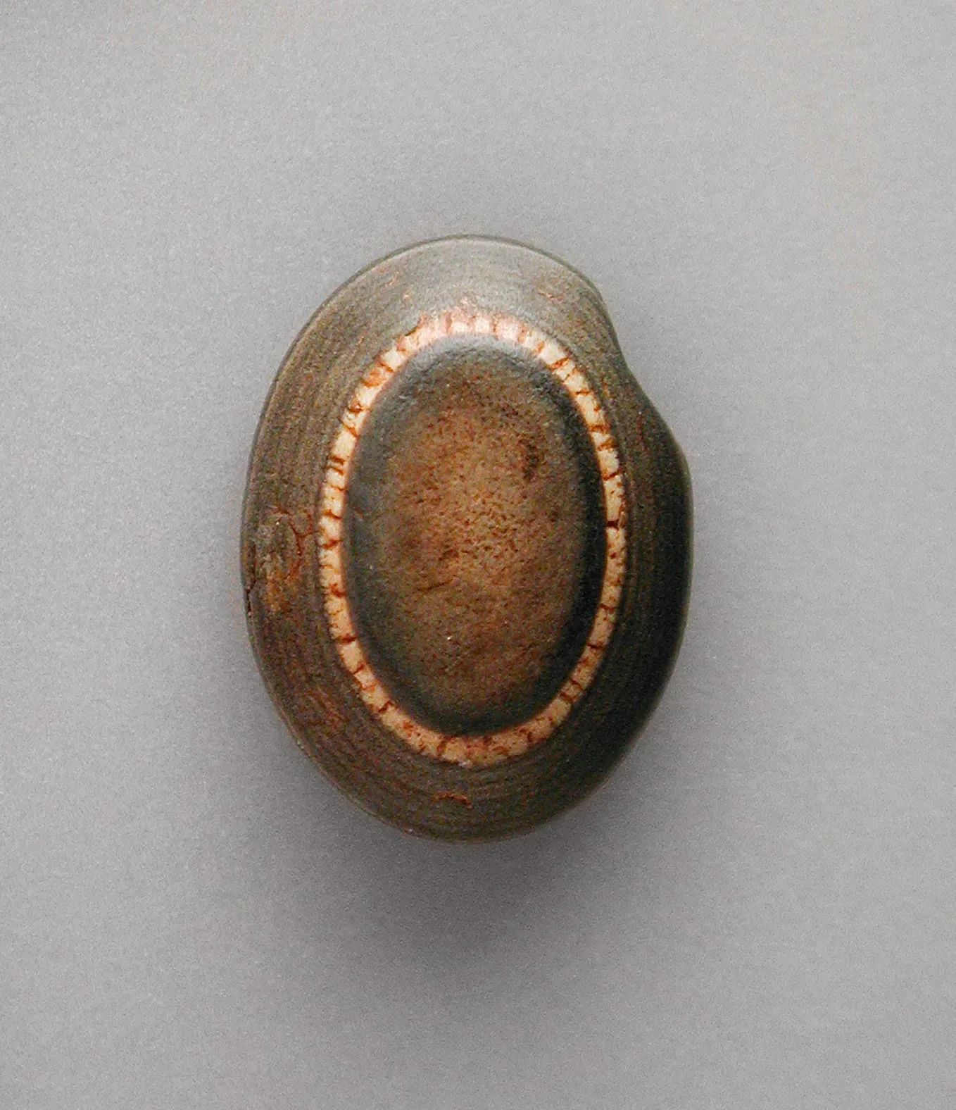 Small glazed ceramic object with an oval form, olive-green and brown glaze, and a recessed central depression encircled by a dotted cream-and-rust channel, seen from above