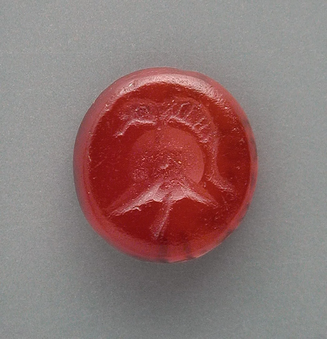 Small circular carnelian intaglio gem with a polished domed surface, carved with a left-facing profile of a crested helmet