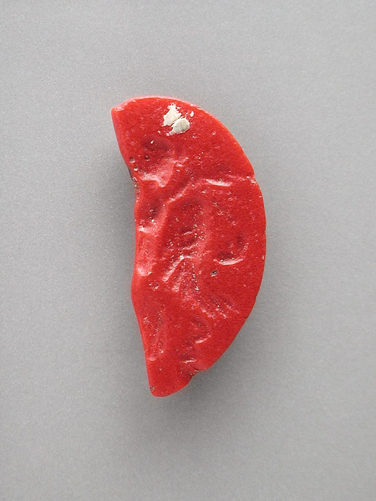 Small crescent-shaped object in vivid red faience or glazed material with an uneven, molded surface and a small white chip near the top, photographed against a gray background