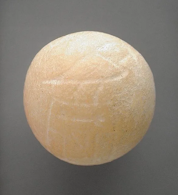 Stone sculpture in the form of a nearly perfect sphere, pale cream and peach in color with faint surface veining, against a gray background