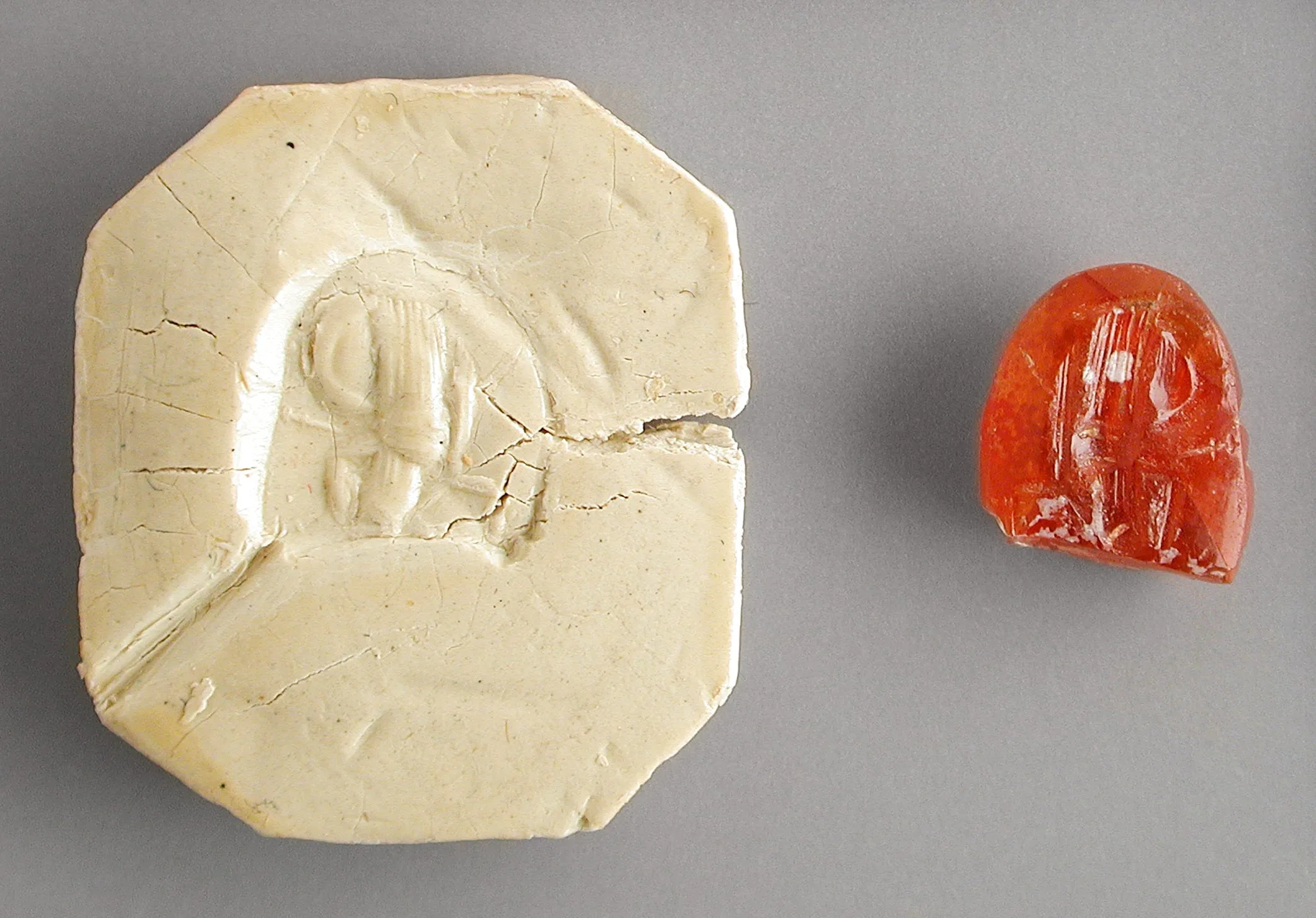 Plaster mold with recessed intaglio impression of a draped figure, shown alongside a small translucent carnelian-red gemstone with carved markings, on a gray surface