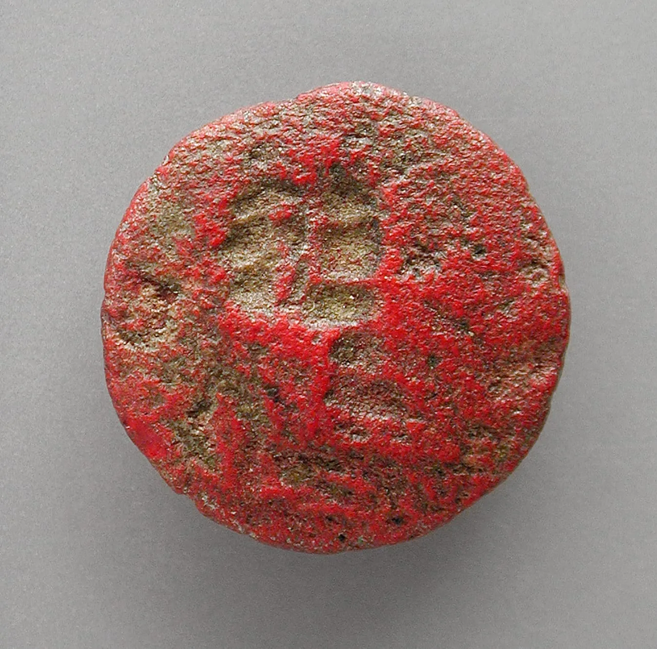 Small circular disk with rough, heavily encrusted crimson-red surface and patches of exposed olive-brown material, photographed from above against a gray background