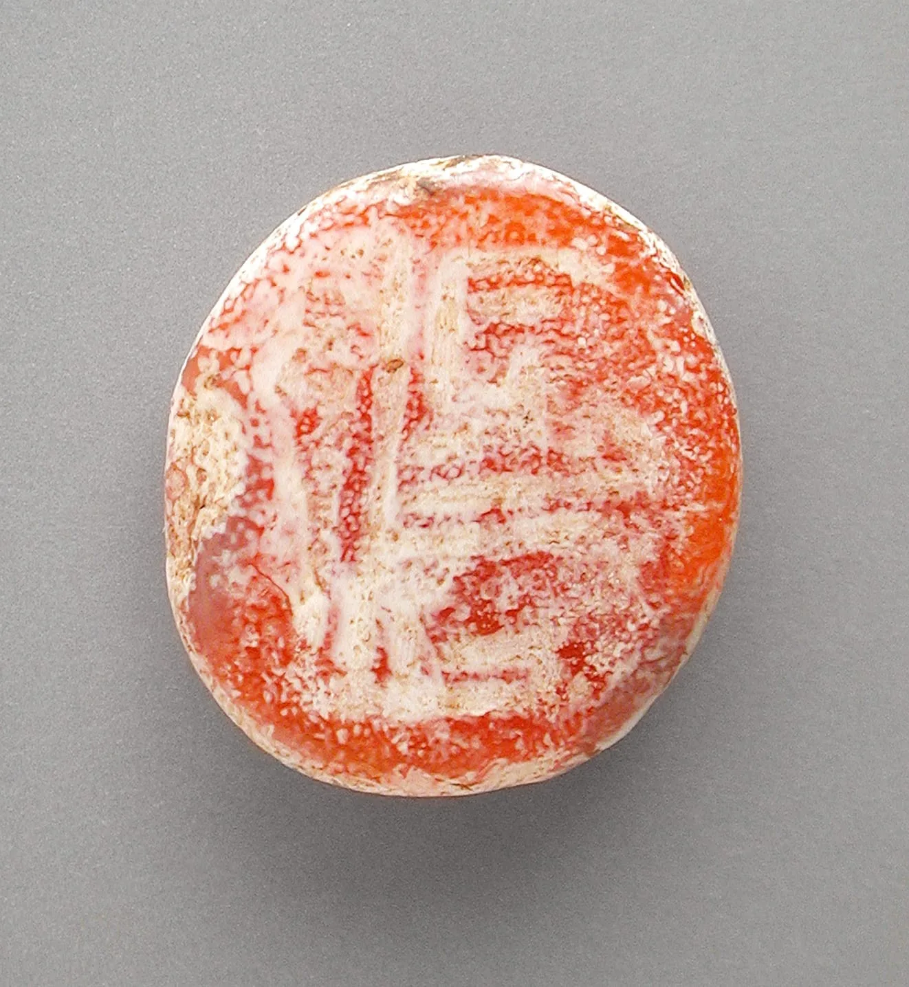 Small oval carnelian or red-stone stamp seal with white surface weathering, incised with hieroglyphic or script characters on its flat face