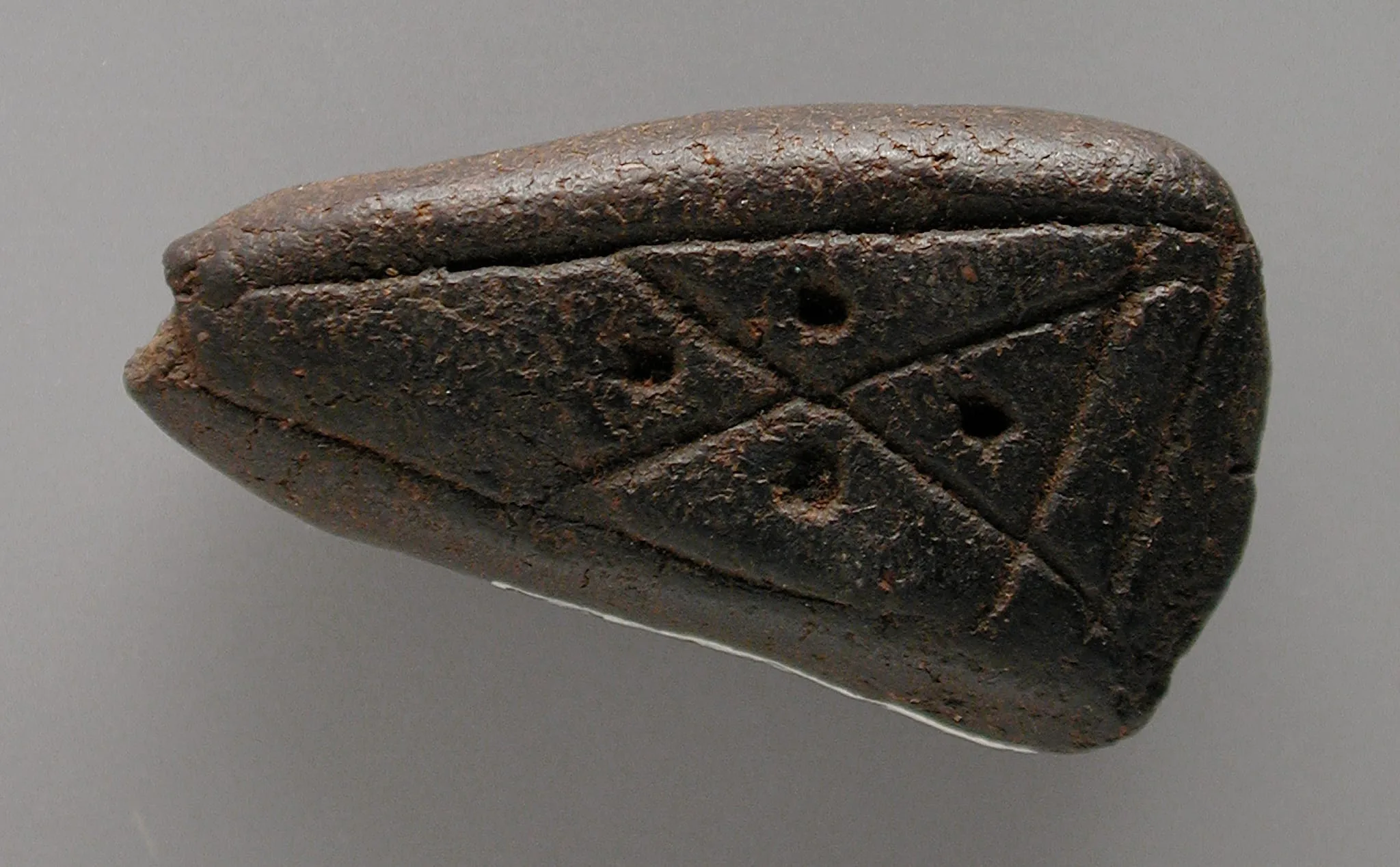 Small fired clay object, teardrop-shaped, with incised X-shaped geometric patterns and small drilled holes on its flat face