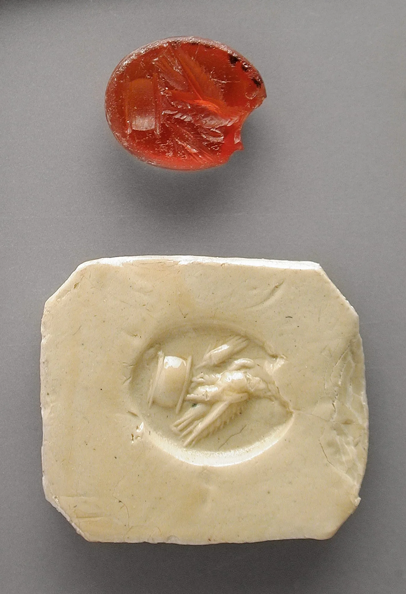 Small translucent red carved gemstone seal and its cream-white plaster impression showing a bird and cylindrical object in low relief