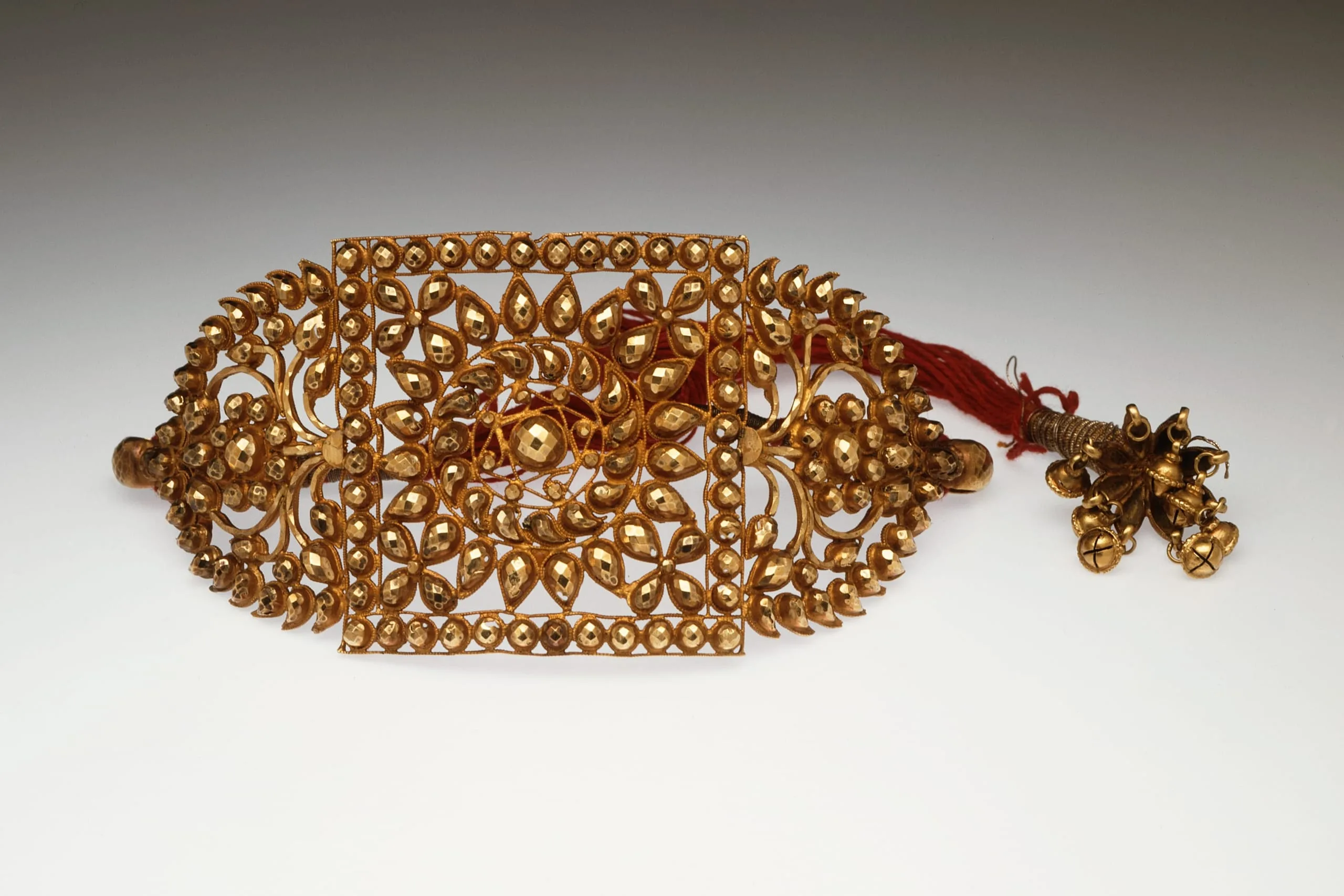 The armlet epitomizes a distinctive style of jewelry from Bengal and neighboring Bangladesh that features an openwork matrix of floral and geometric designs with facetted repoussé studs that sparkle from the light reflected by the myriad surface planes. Often combined with wire filigree, Bengal jewelry is renowned for its light weight and elegance.