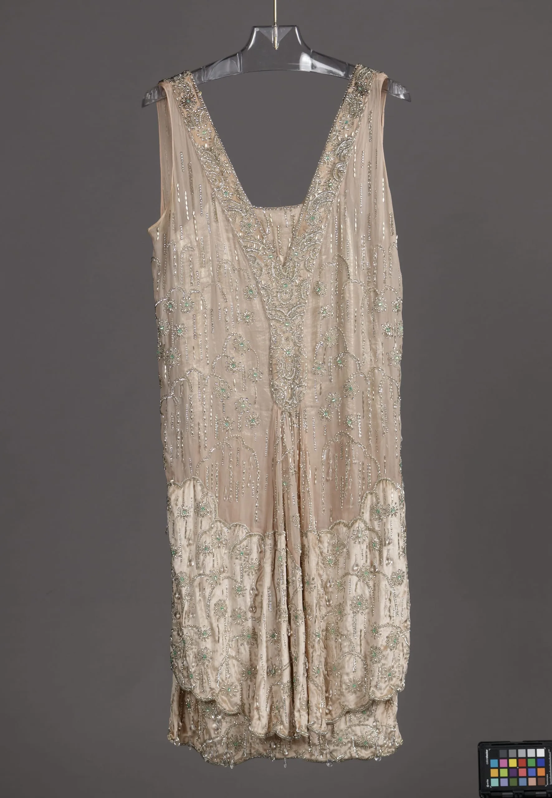 - Silk plain weave (crepe chiffon) and metallic-thread and silk satin (lamé) with silk velvet, crystals, glass beads, metal beads, and metal sequins