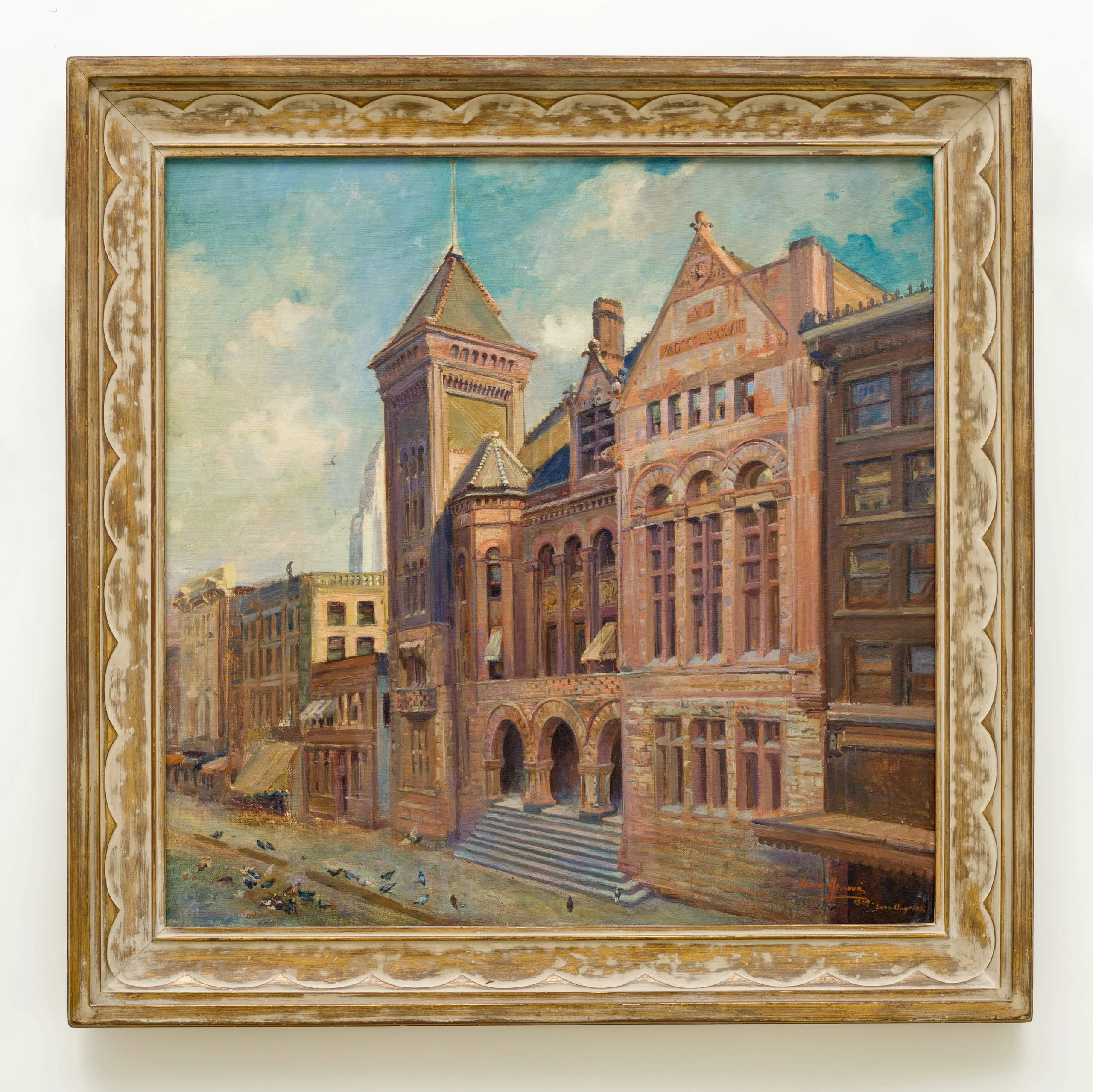 Soon after her arrival in Los Angeles in late 1928 Hessova began this view of the old City Hall, just before it was demolished early in 1929. The Richardsonian Romanesque structure was erected in 1888 at Broadway Street between Second and Third streets in what was originally the civic center of the city. With the completion of the new City Hall in 1927, the structure was considered obsolete and in an inappropriate location and was torn down.
