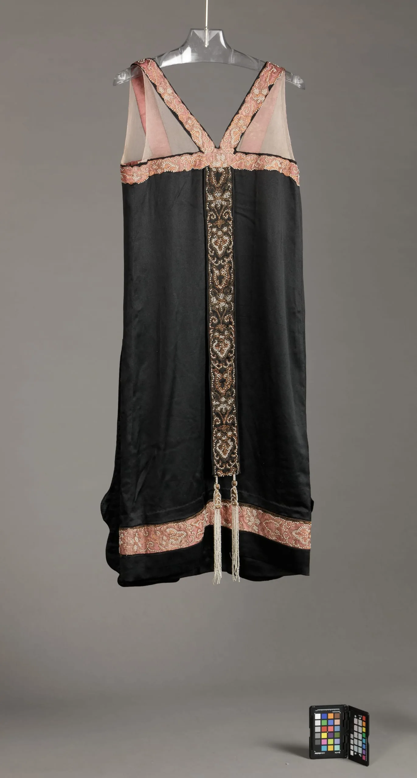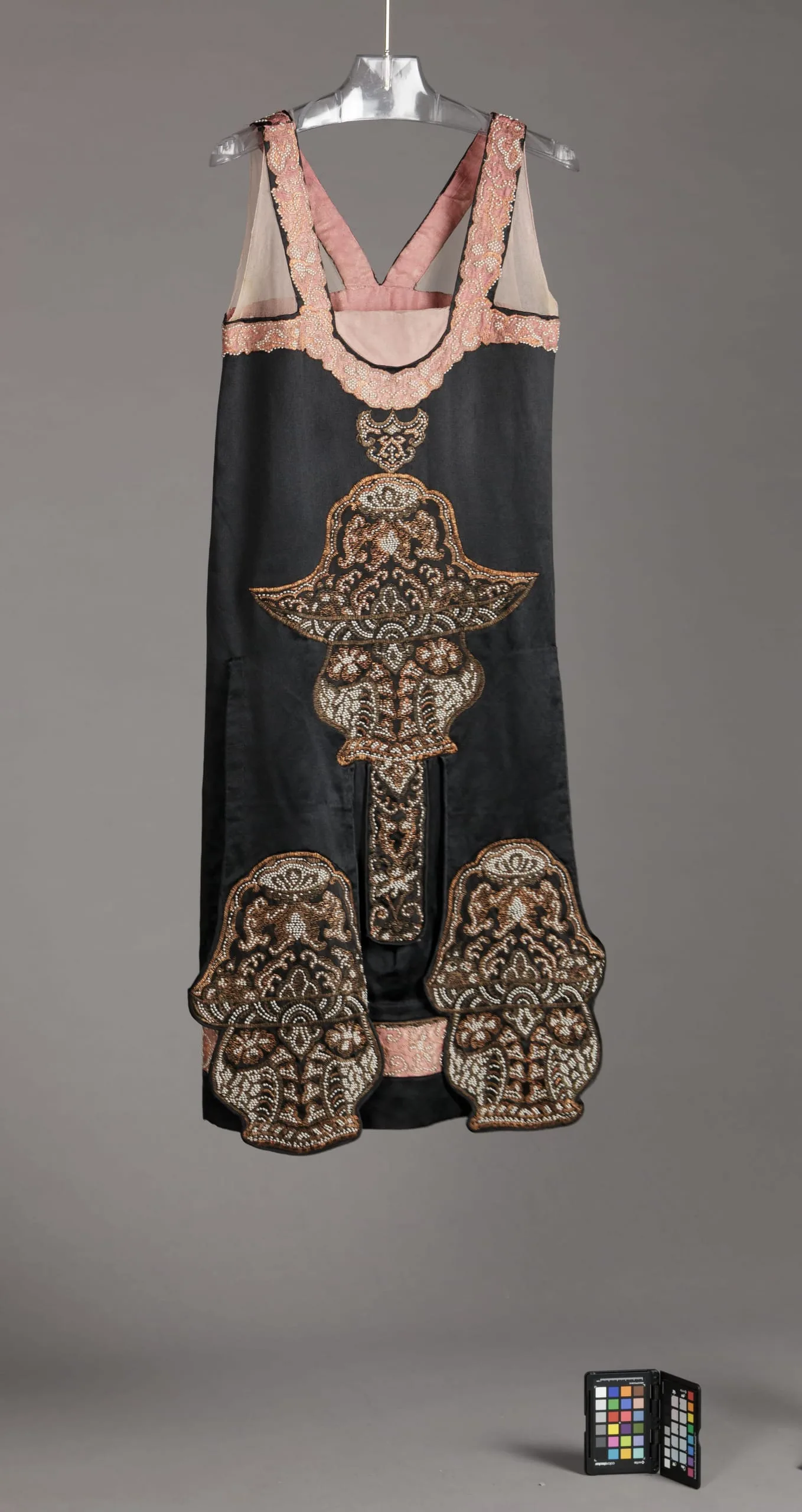 - Silk satin (crepe back) and silk plain weave with metallic-thread supplementary-weft patterning, metallic-thread embroidery, faux pearls, and silk tulle