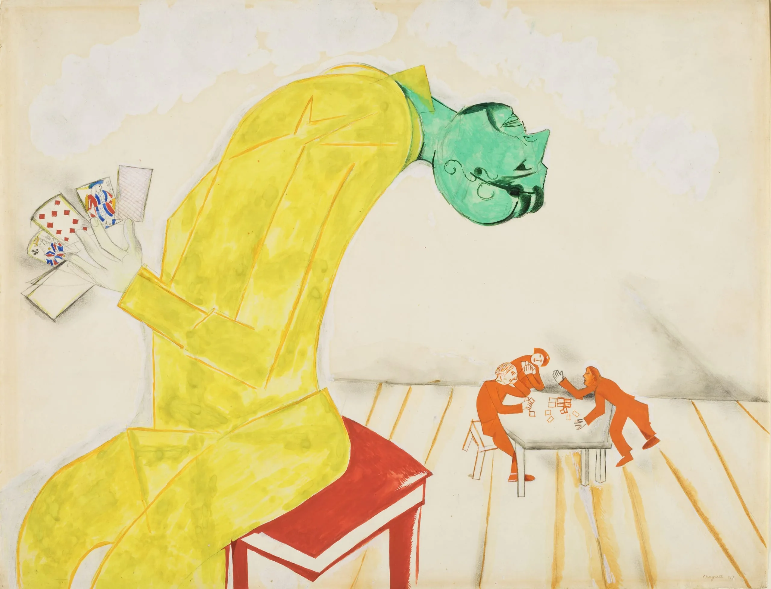 The Gamblers is related to a commission Marc Chagall received in 1919 to design scenery for a production of Nicolati Gogol's 1843 play of the same name at the Hermitage Theater in St. Petersburg. The influence of Russian folk art and mysticism that came to define the artist's work is perceptible in the drawing, which is characterized by bold and expressive colors and anatomical and spacial distortions. The spare palette of The Gamblers, as well as its simplicity and clarity of drawing and composition, bespeak its connection to a theater set.