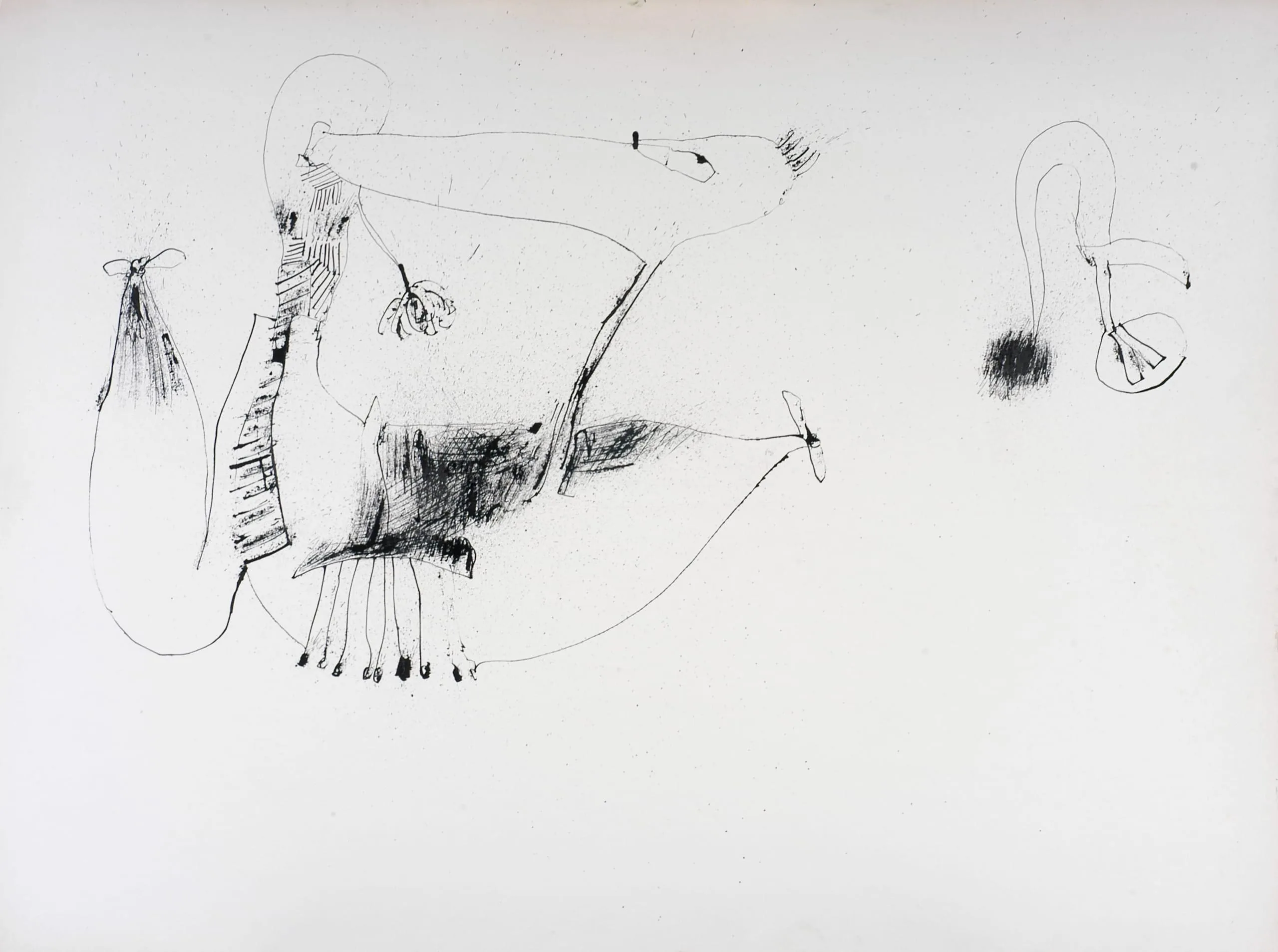 Ink drawing on off-white paper of two fantastical hybrid creature forms, one large with spindly clawed legs and a long neck, one small, rendered in loose spontaneous lines