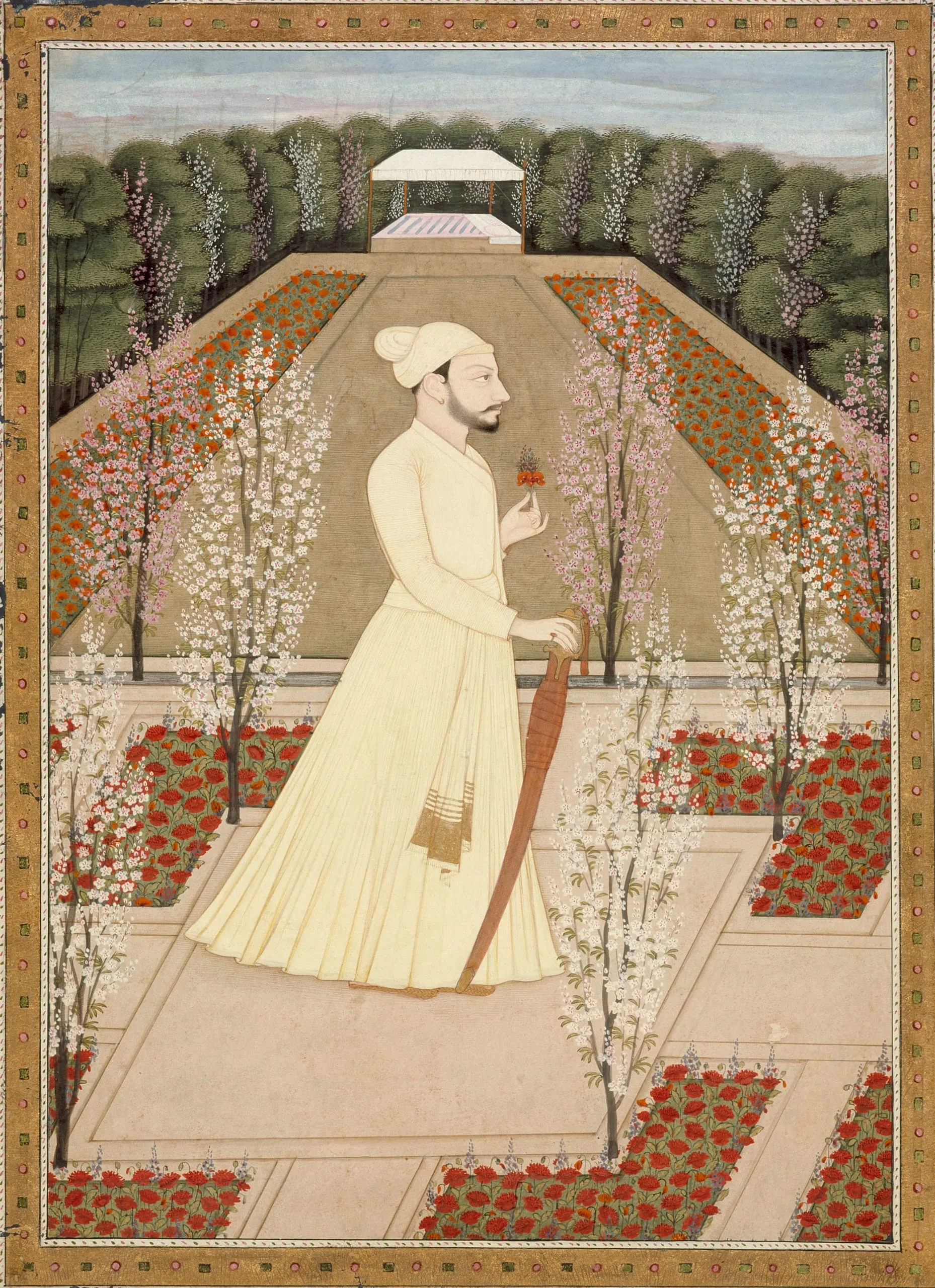 In this painting, Amrit Pal stands in a flowering garden represented in linear perspective with an empty canopied bed in the distance. His only jewelry is an earring and a pinky ring. He wears a long white coat (jama) with a matching turban and waist sash, the ends of the latter embellished with gold embroidery. He holds a bouquet and the hilt of a sheathed sword with its sword belt wrapped around the scabbard.