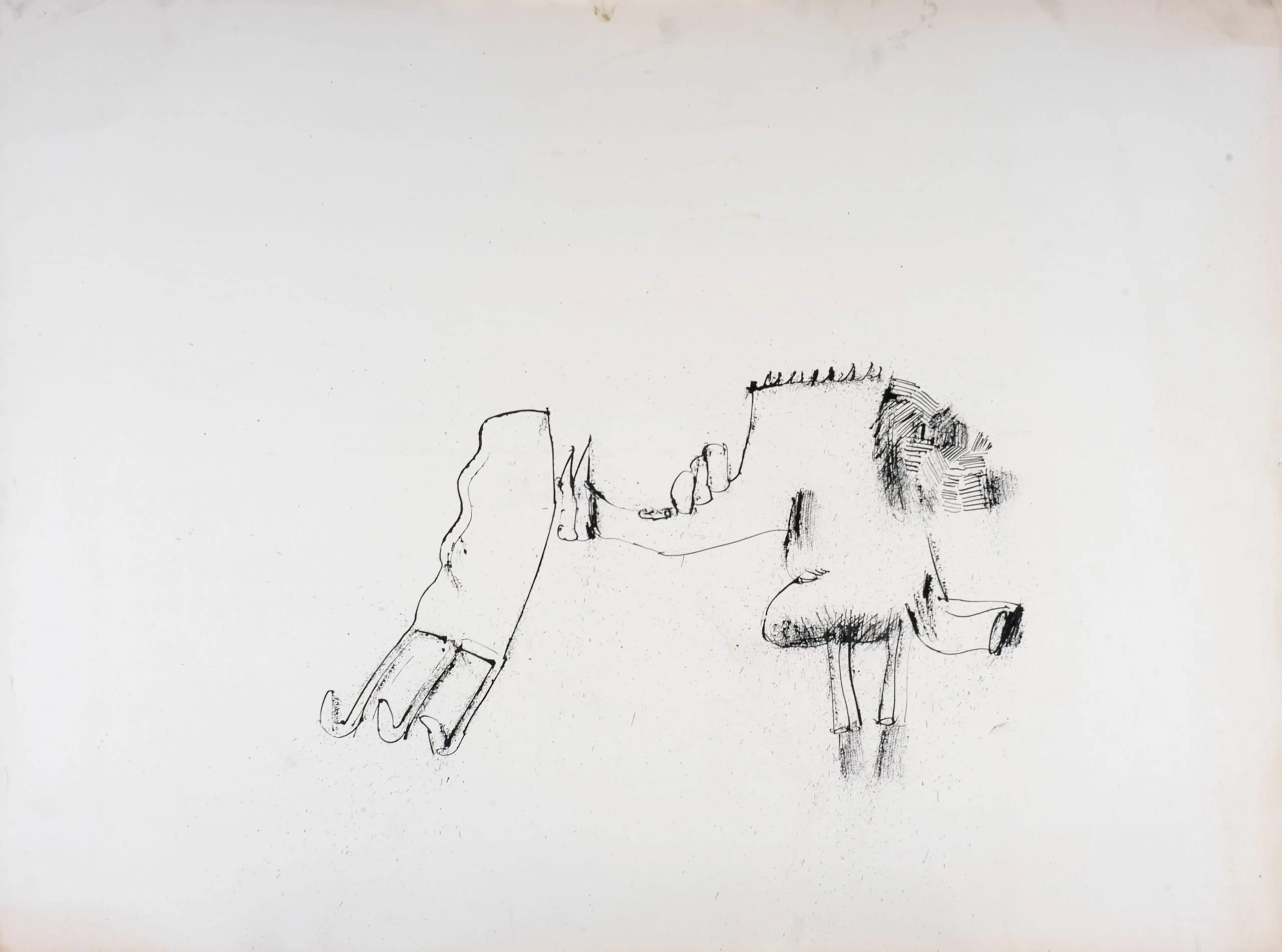 Drawing in black ink and smudged marks on off-white paper, two loosely sketched animal-like figures connected by a thin line, one outlined in contour and one heavily cross-hatched