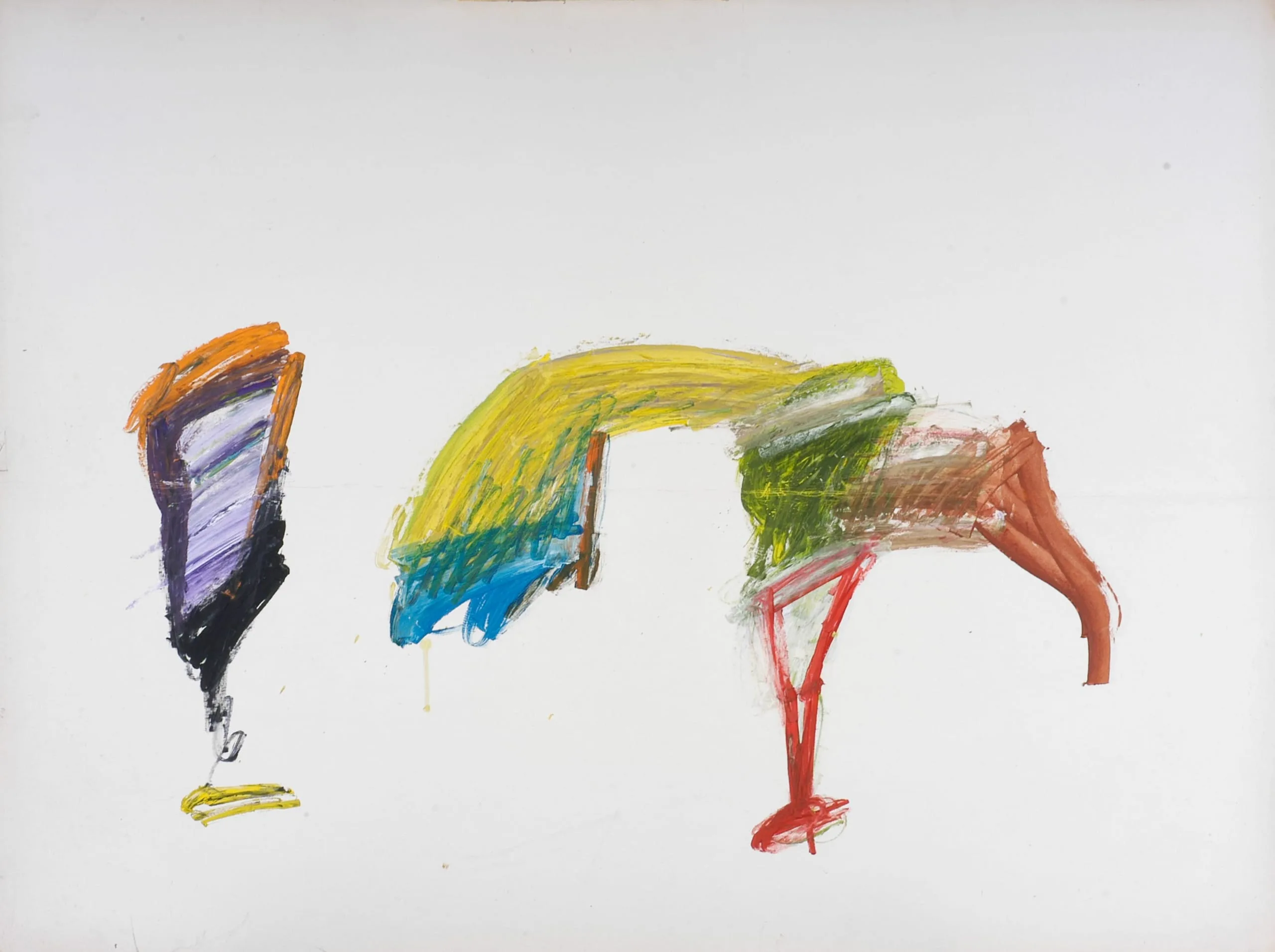 Abstract painting with gestural oil stick marks forming two loosely suggested bird-like figures in orange, purple, yellow, green, teal, and red on a white ground
