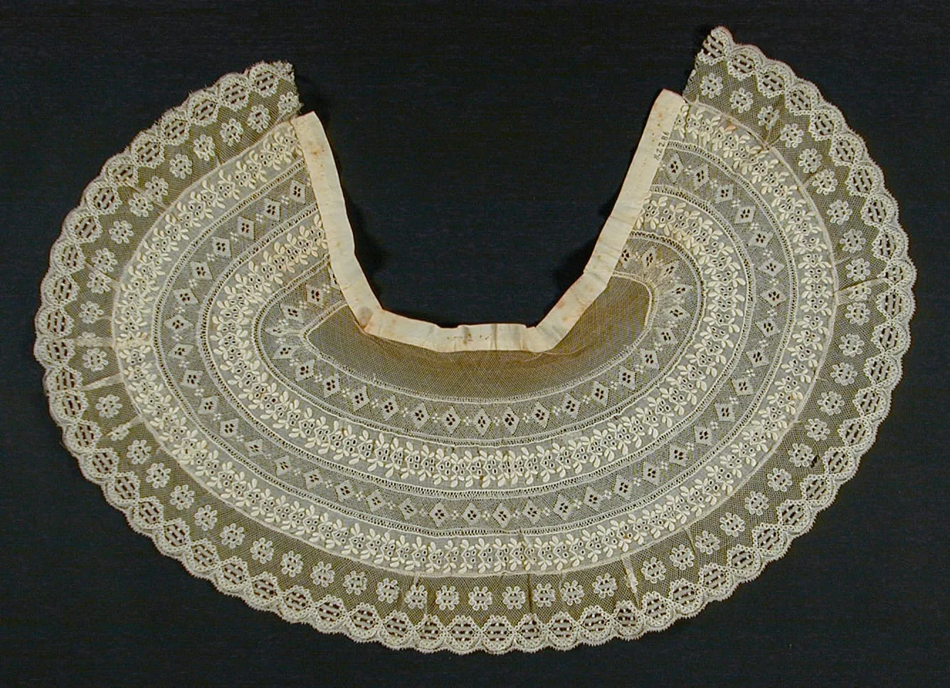 Flat lace collar in cream and ivory, crescent-shaped with concentric bands of floral and rosette patterns, scalloped outer edge, gathered fabric neckband at center top