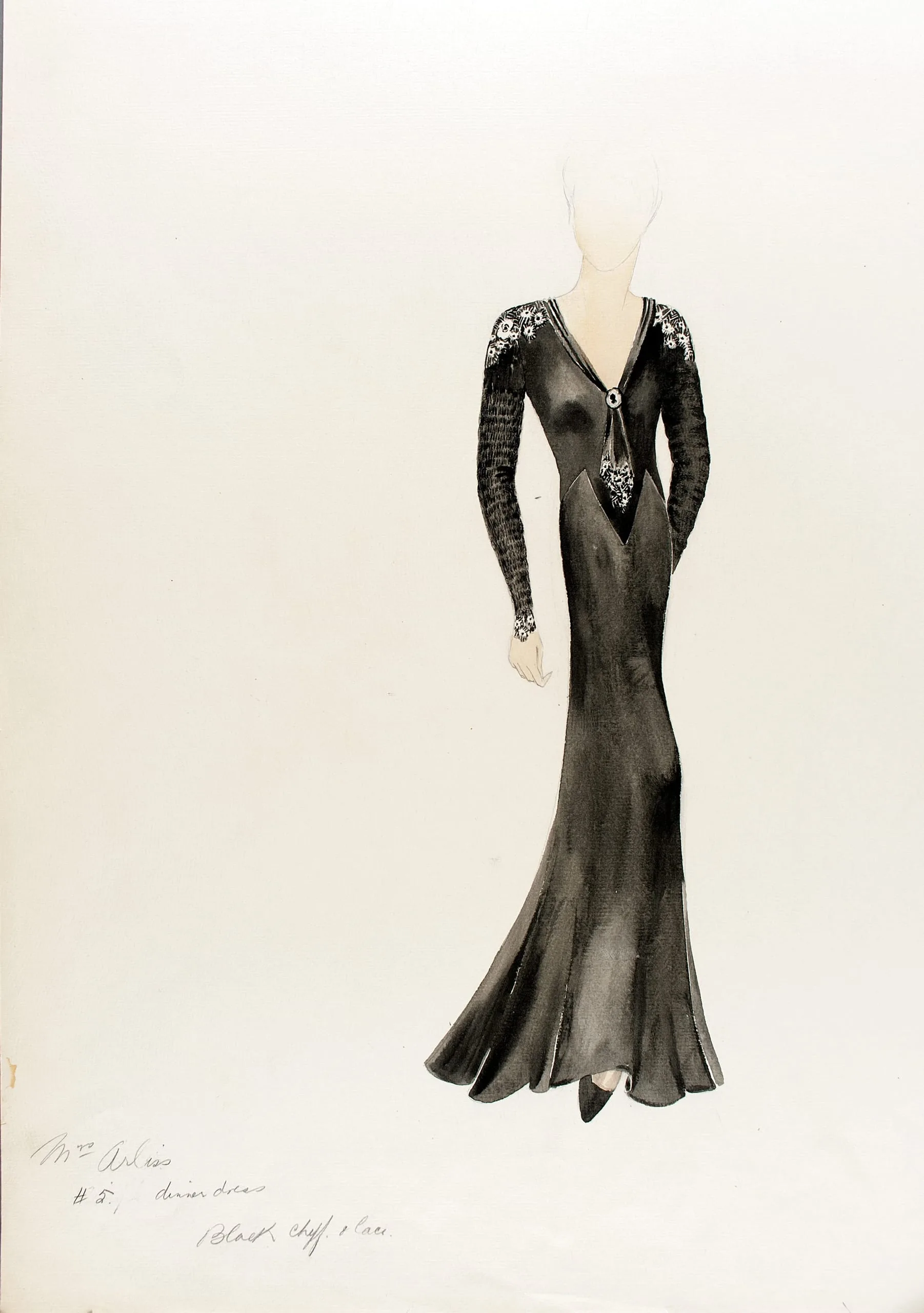 Watercolor and ink fashion illustration of a floor-length black evening gown with lace sleeves and floral shoulder embellishments on a headless mannequin figure