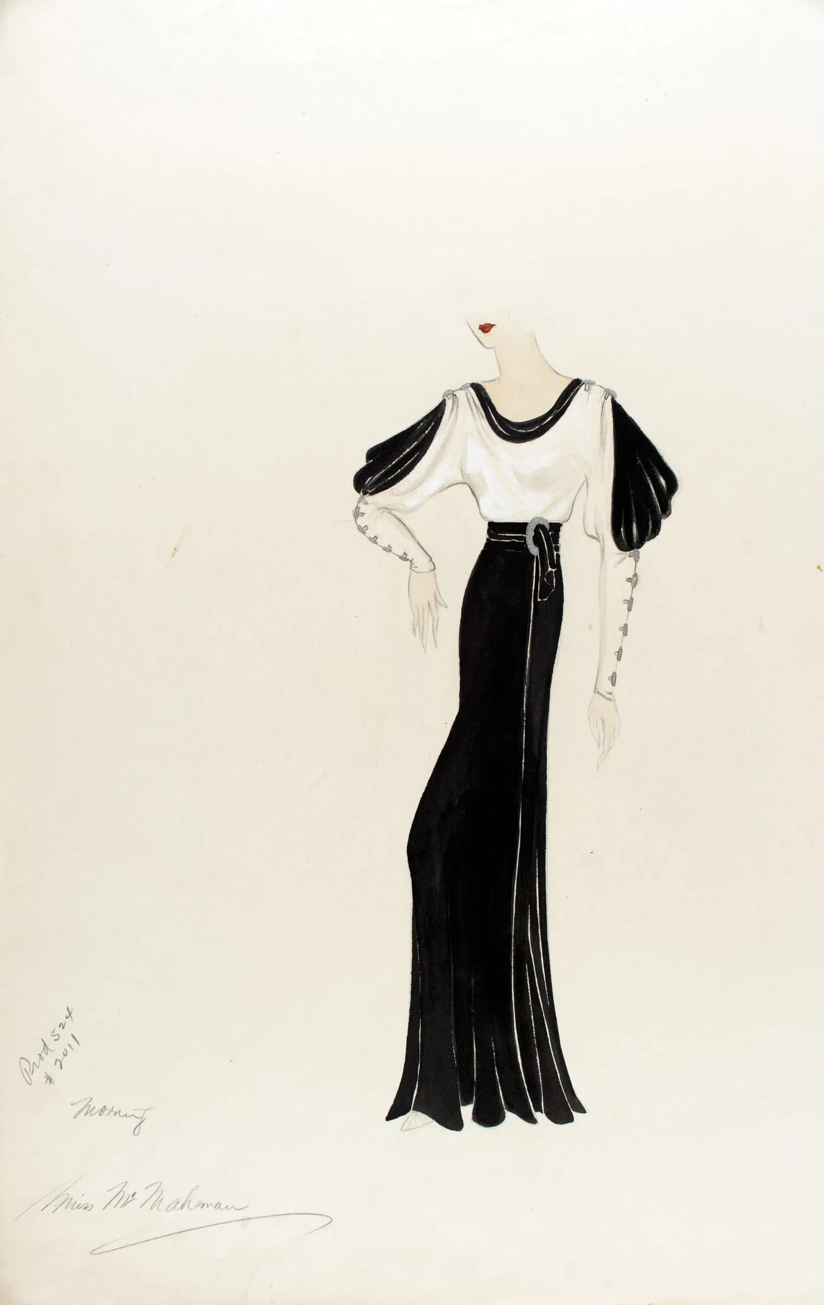 Fashion illustration in ink and gouache on cream paper, full-length standing figure in a white puffed-sleeve blouse and long black skirt, with handwritten annotations below