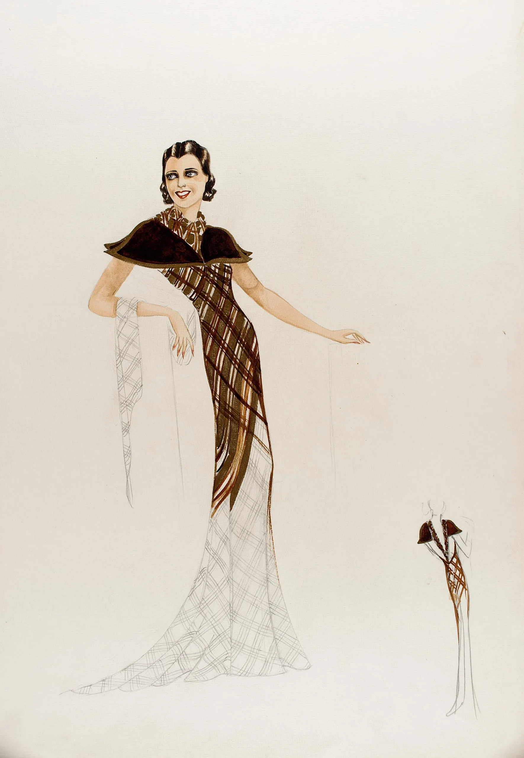 Fashion illustration in pencil and gouache on cream paper, full-length figure of a woman in a plaid evening gown with a dark cape collar, partially rendered in brown and copper tones