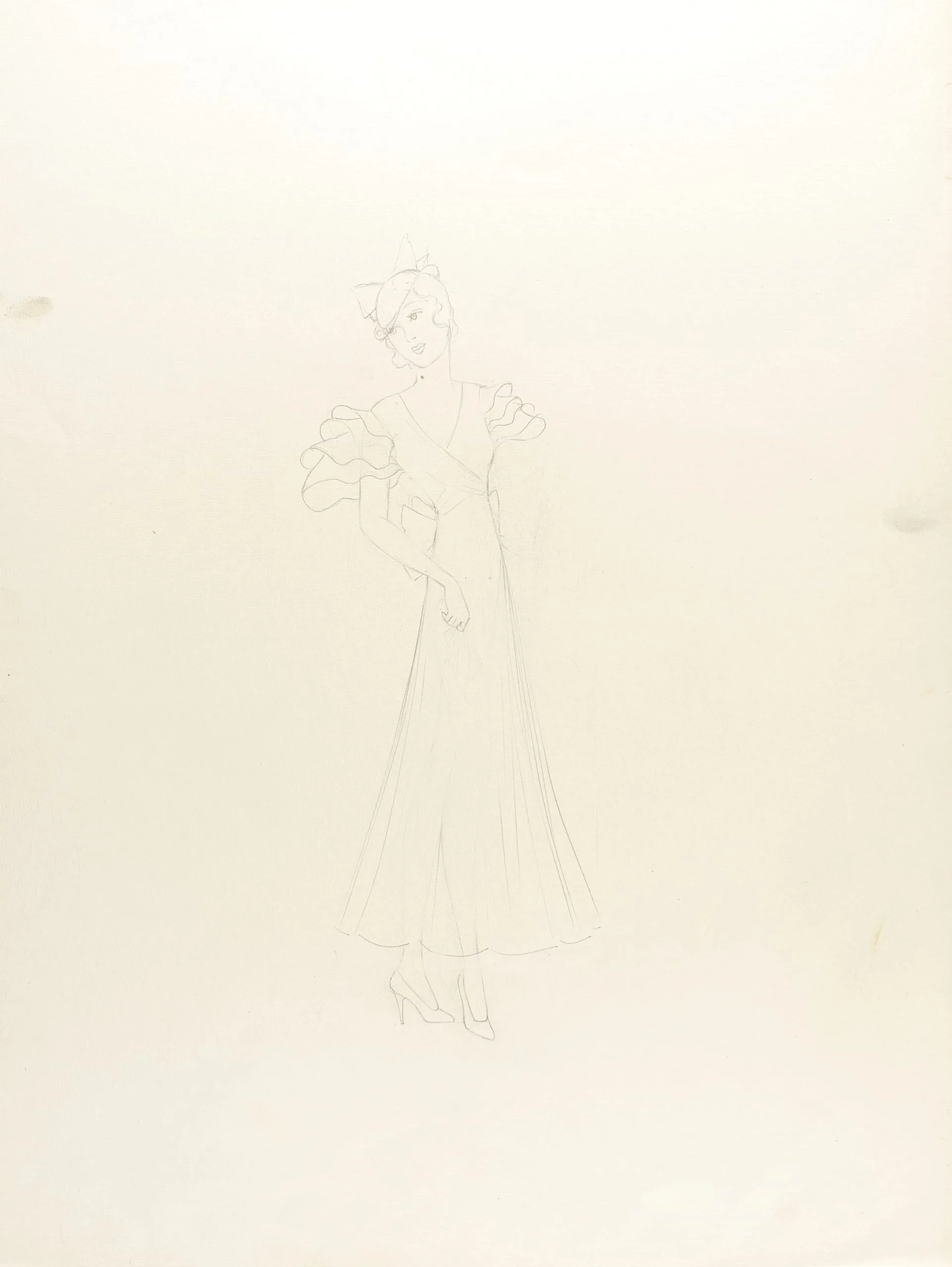 Pencil sketch on cream paper, full-length figure of a woman in a floor-length gown with large ruffled shoulder details, loosely rendered in light graphite lines