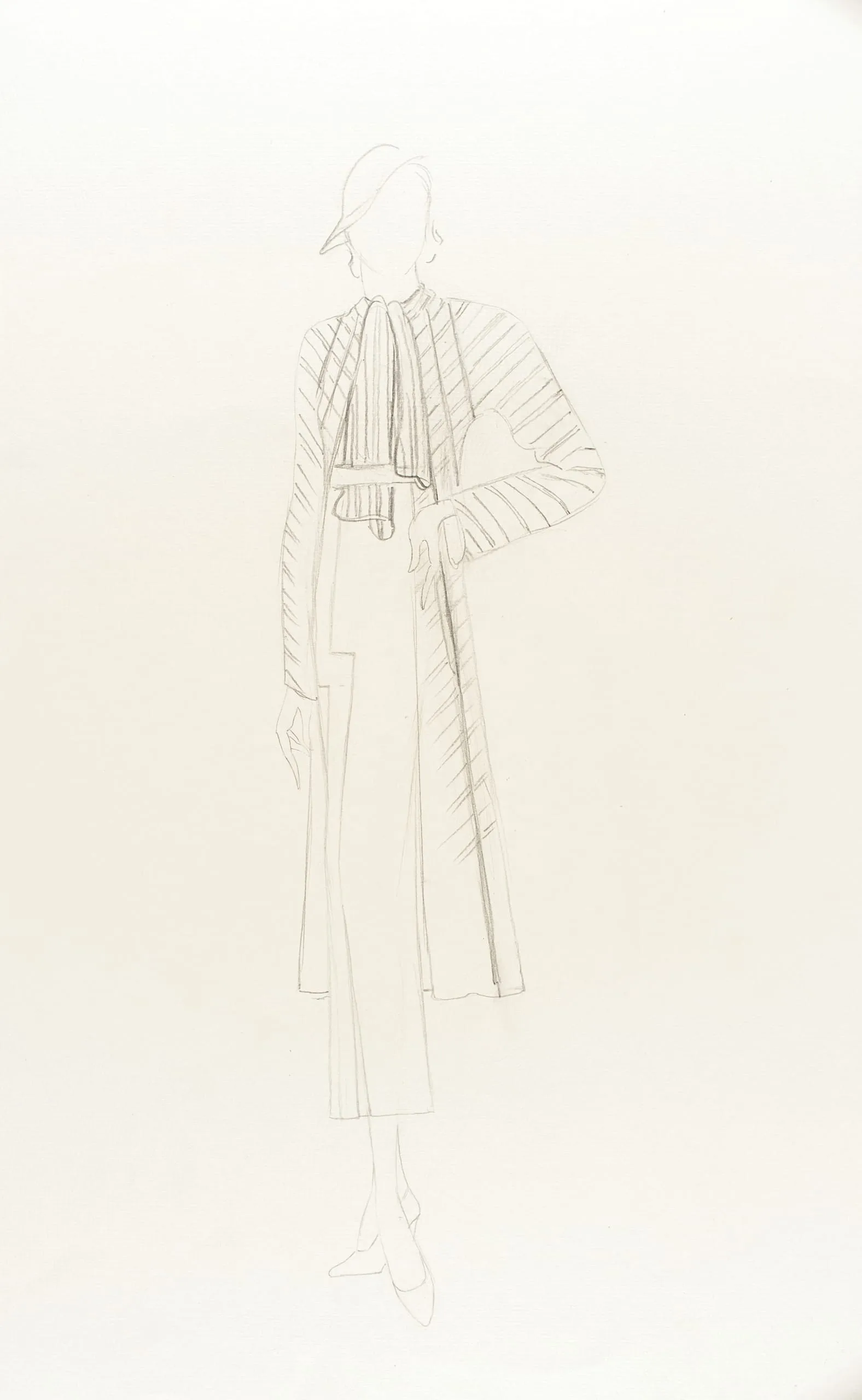 Graphite fashion illustration on off-white paper, full-length standing figure in a belted long coat with diagonal stripe hatching on the sleeves and collar
