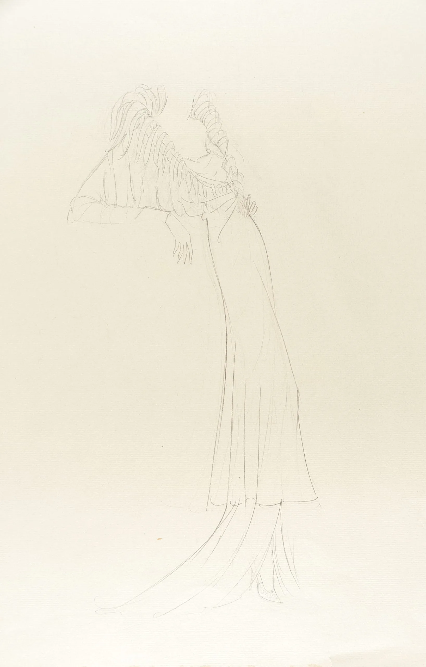 Graphite drawing of two robed figures with curling hair facing each other, drawn with spare, light lines on cream paper