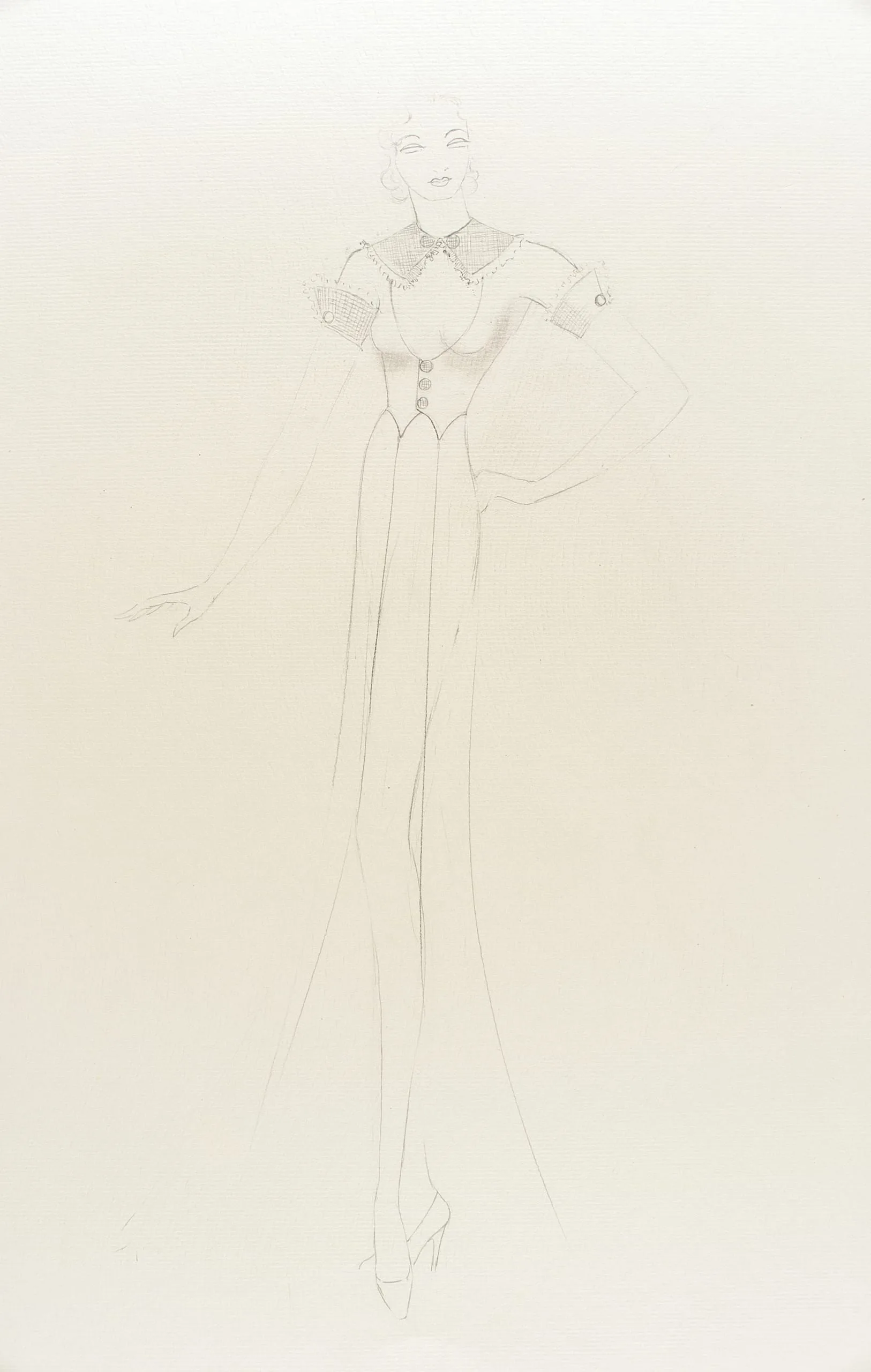 Pencil fashion illustration on cream paper, elongated female figure in a fitted bodice with voluminous sleeves, checked collar and cuffs, and a long, narrow paneled skirt