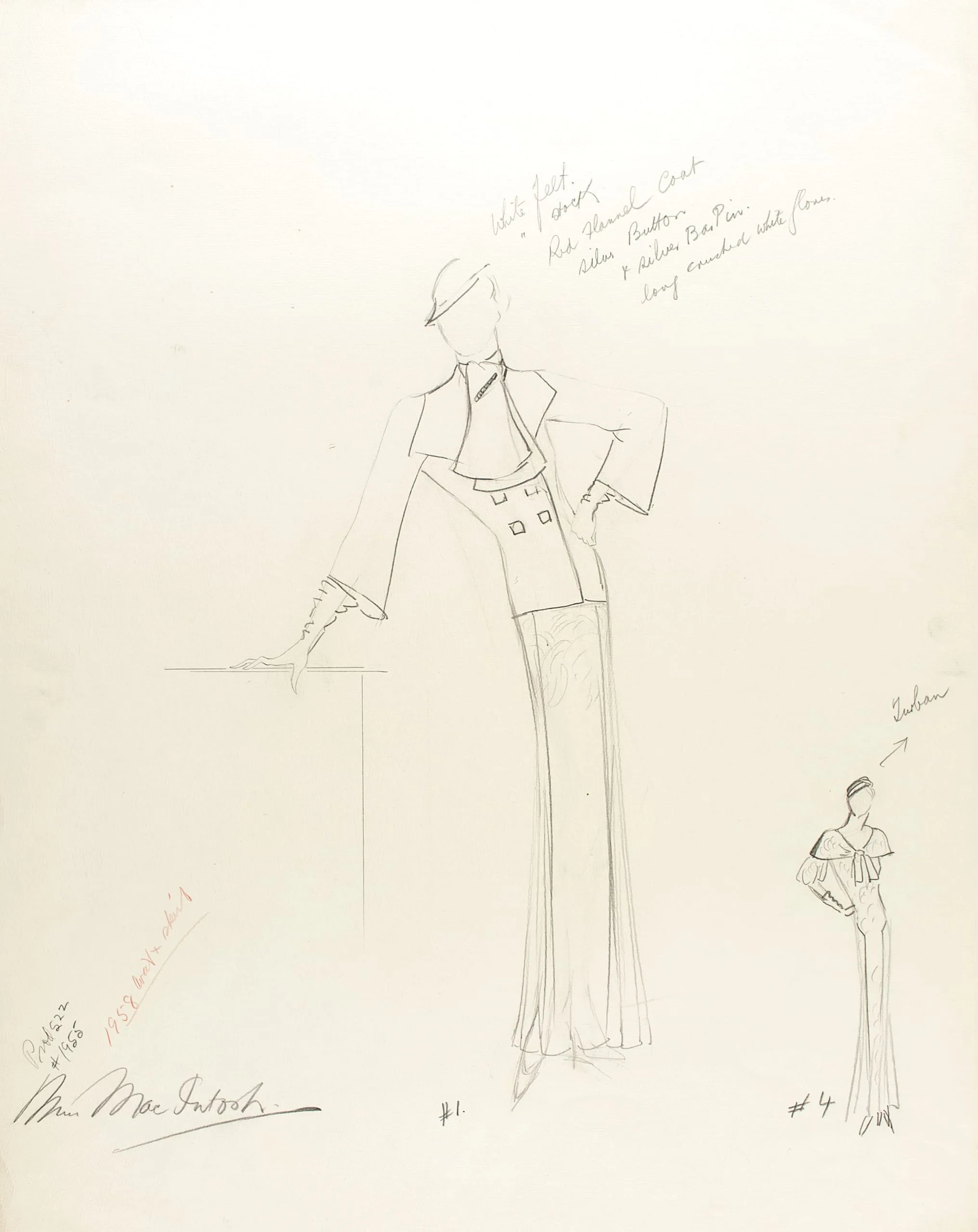 Graphite fashion illustration on cream paper, full-length figure in wide-sleeved coat and long skirt, with a smaller secondary sketch and handwritten annotations