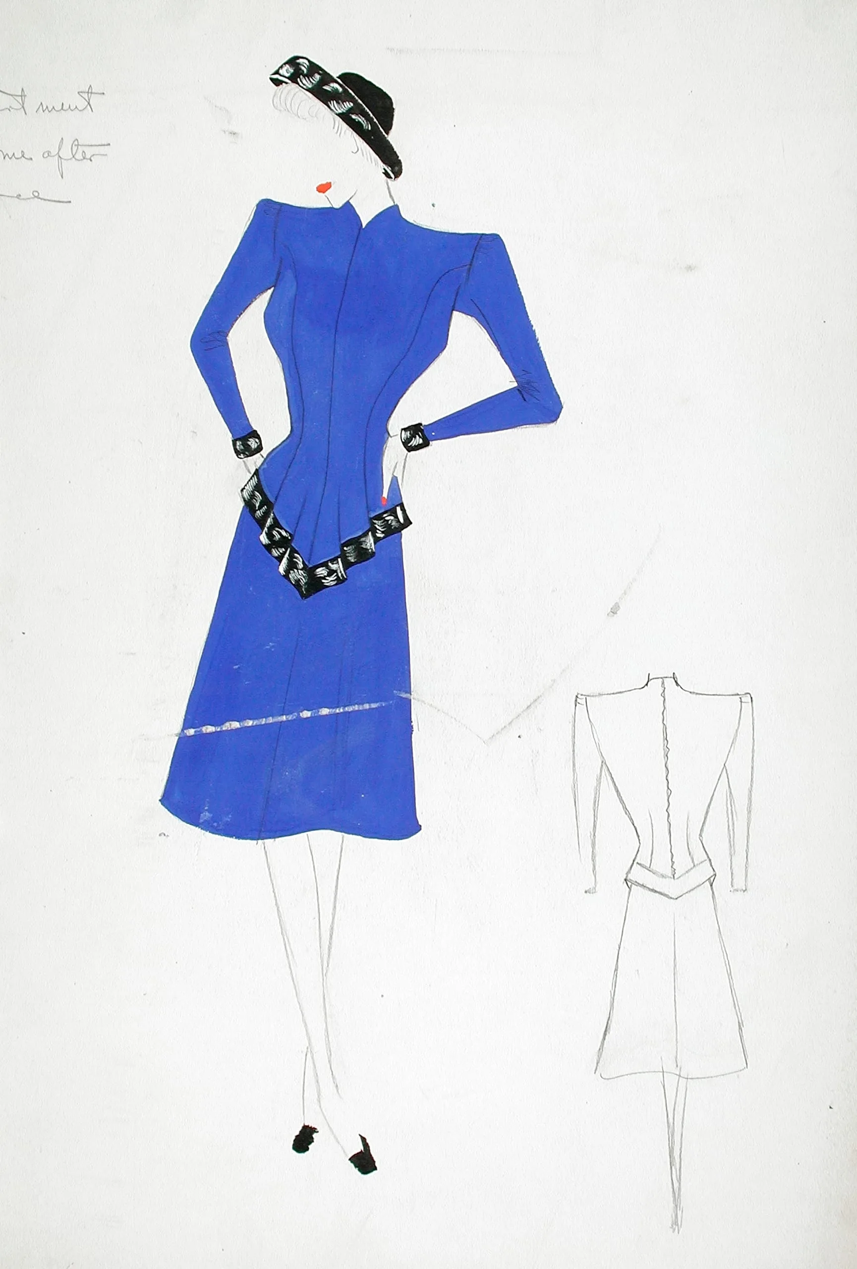 Fashion illustration in pencil and cobalt blue gouache showing a stylized figure in a fitted dress with black printed trim, with a smaller back-view sketch in pencil