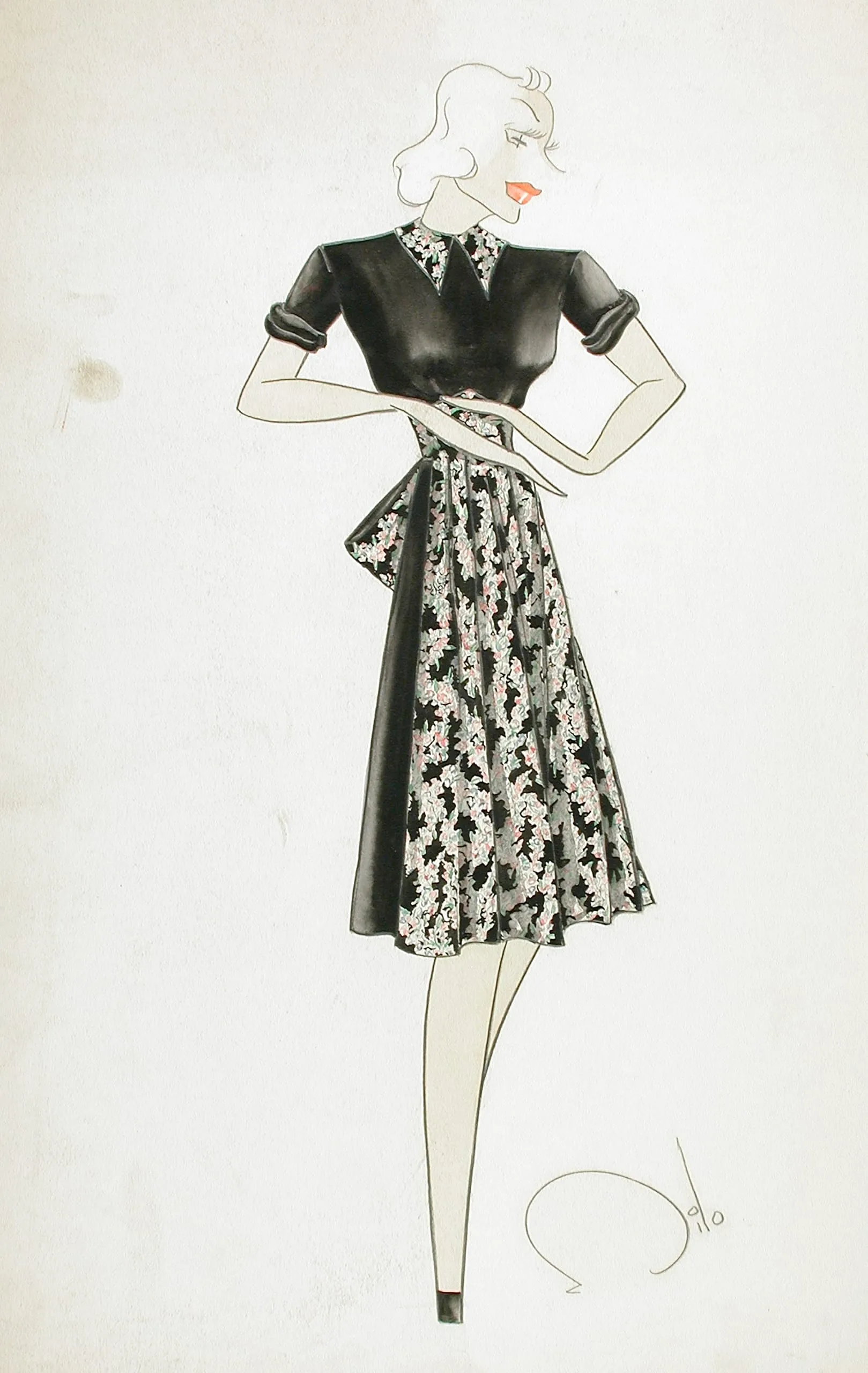 Fashion illustration in ink and watercolor, full-length female figure in three-quarter back pose wearing a black satin bodice and floral-patterned skirt