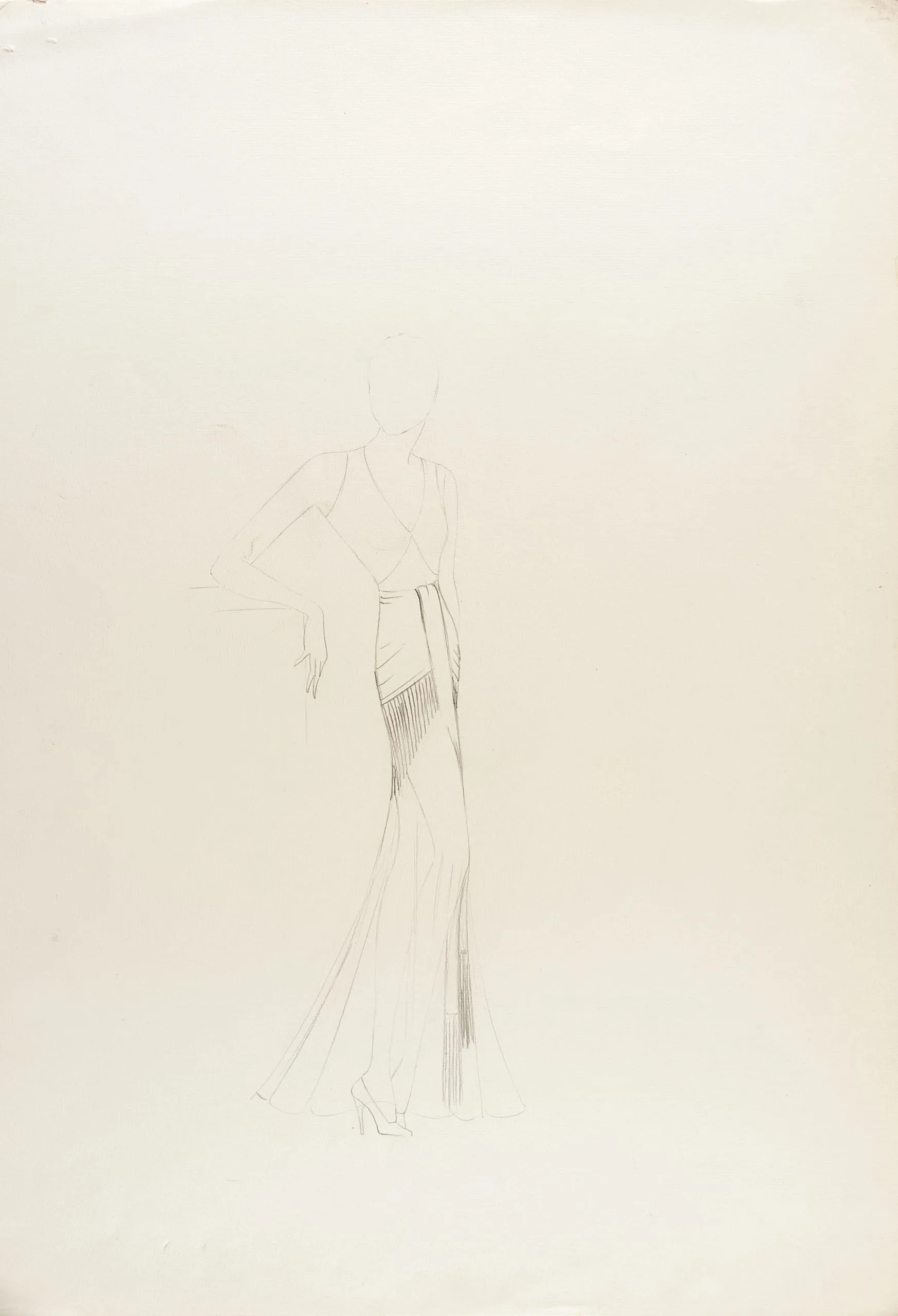Graphite fashion sketch on cream paper, a standing figure in a full-length gown with fringe detail at the hip, rendered in sparse gestural lines