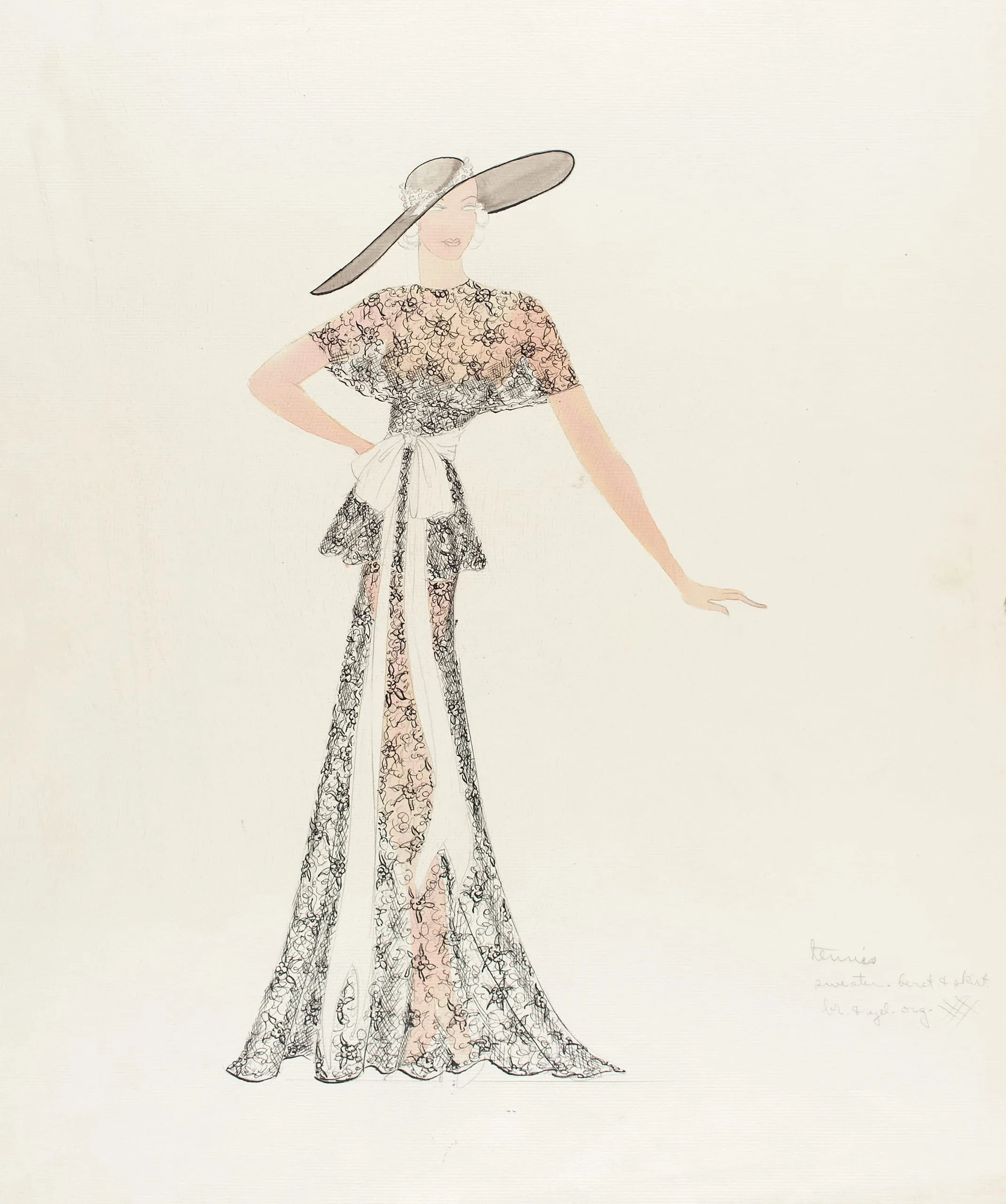 Fashion illustration in ink and watercolor on cream paper, full-length figure in a floral lace gown with wide-brimmed hat and white sash at the waist