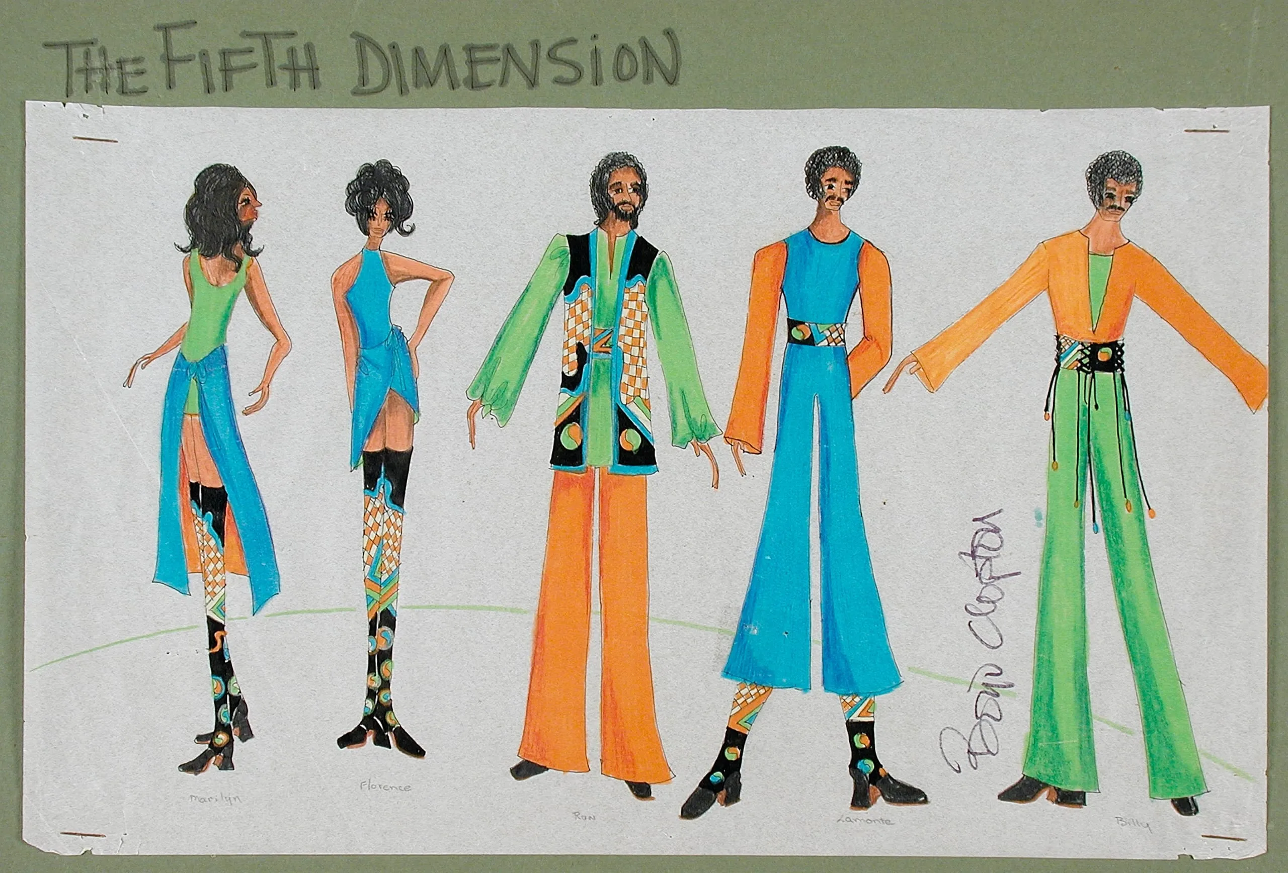 Gouache or marker costume design drawing on paper of five elongated figures in vibrant 1970s-style outfits in turquoise, orange, and green, labeled 'The Fifth Dimension'