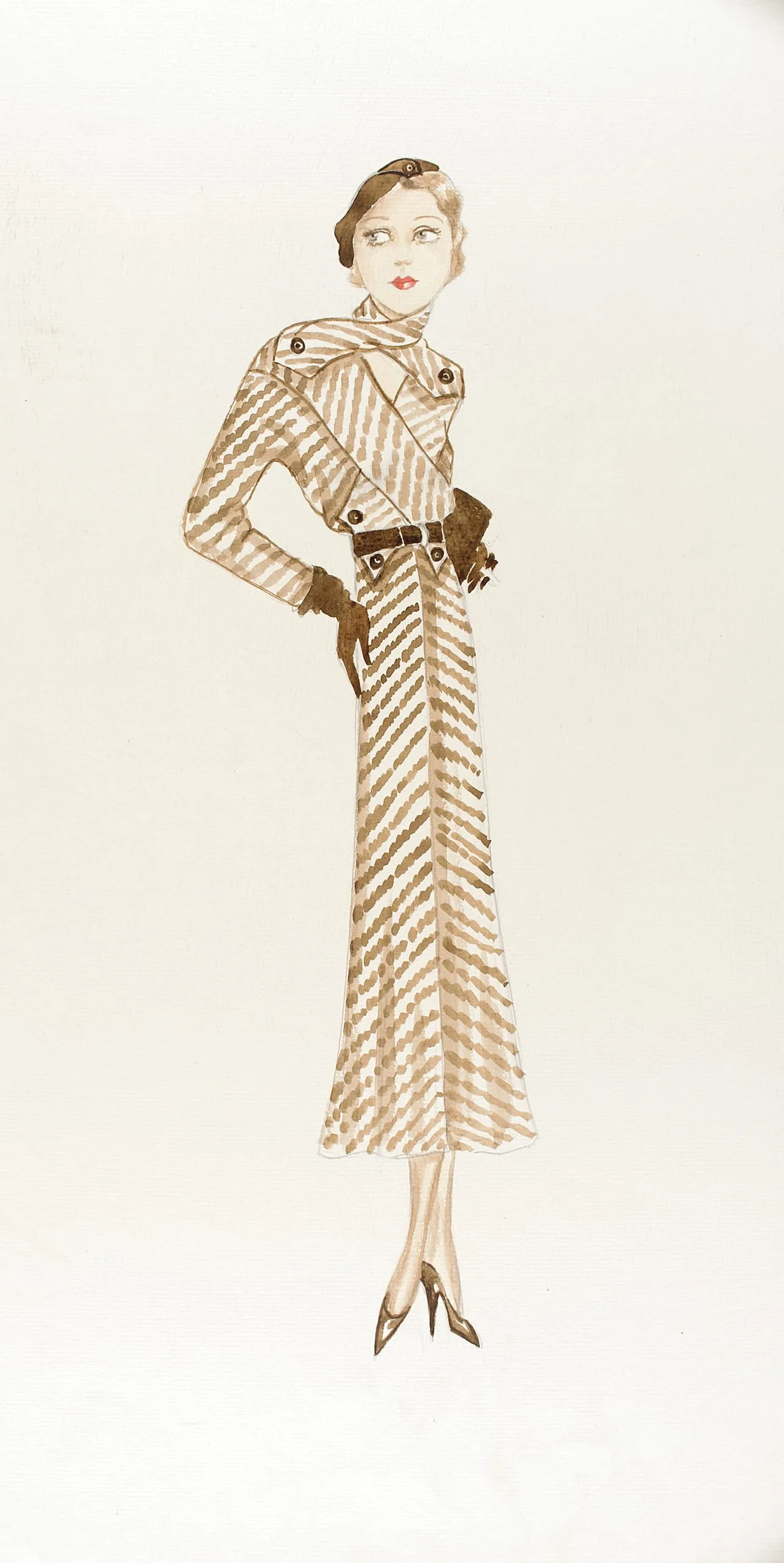 Fashion illustration in brown ink and wash on cream paper, full-length figure of a woman in a striped chevron dress with belt and epaulettes
