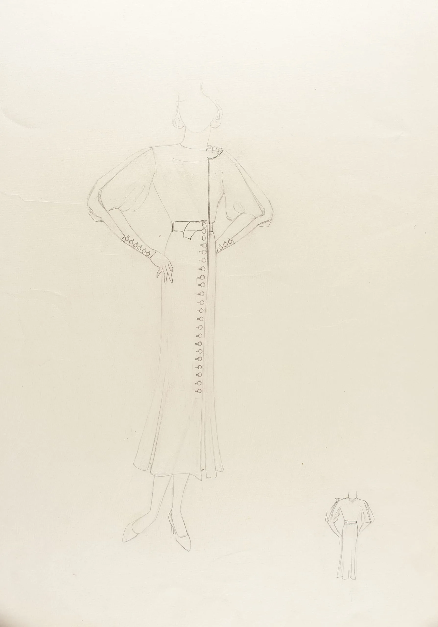 Pencil fashion illustration on cream paper, full-length figure of a woman in a midi dress with puffed sleeves, belted waist, and a decorative vertical button panel; small back-view sketch at lower right