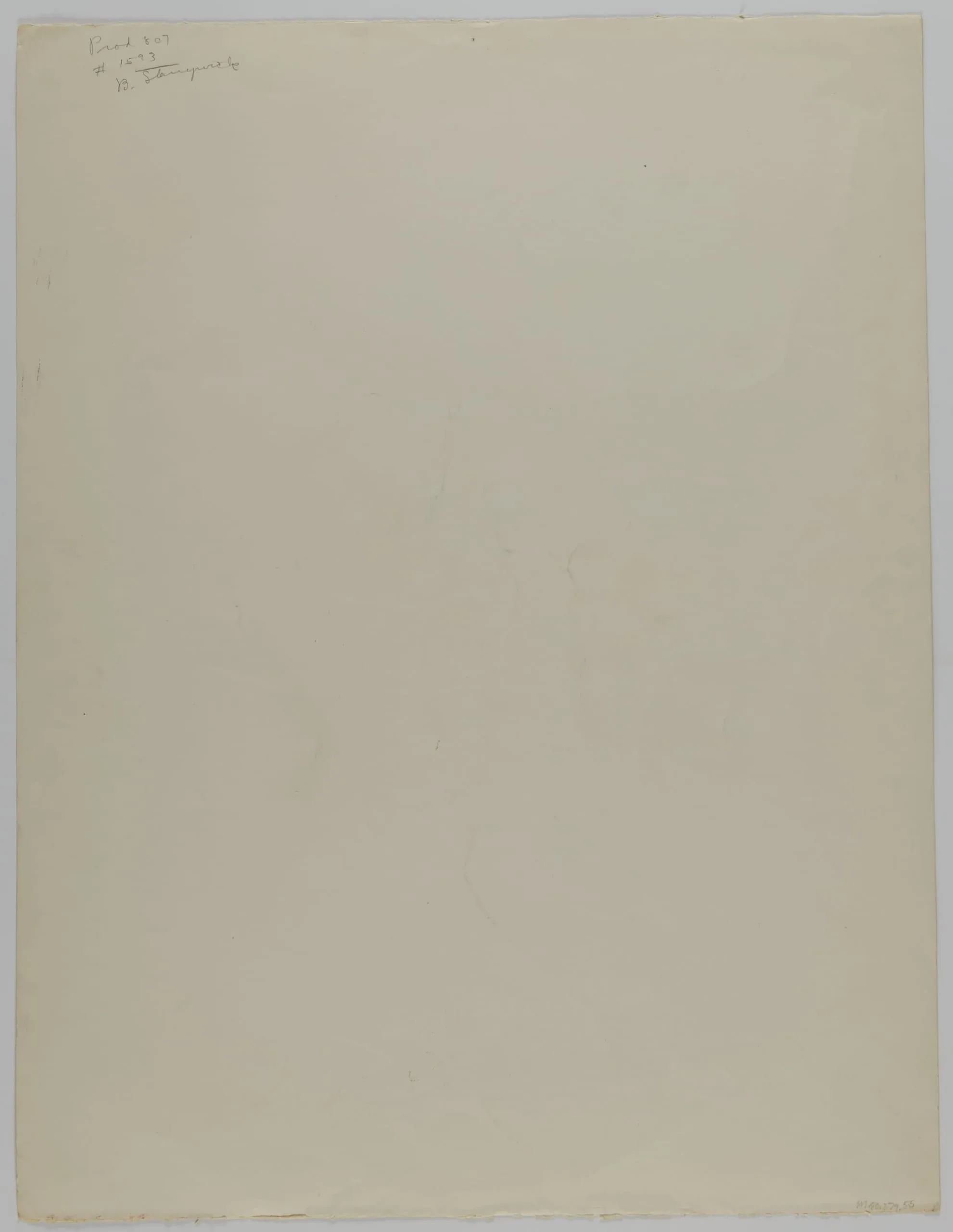 Verso of a sheet of paper with handwritten inscriptions in pencil at upper left, otherwise blank with slight toning.