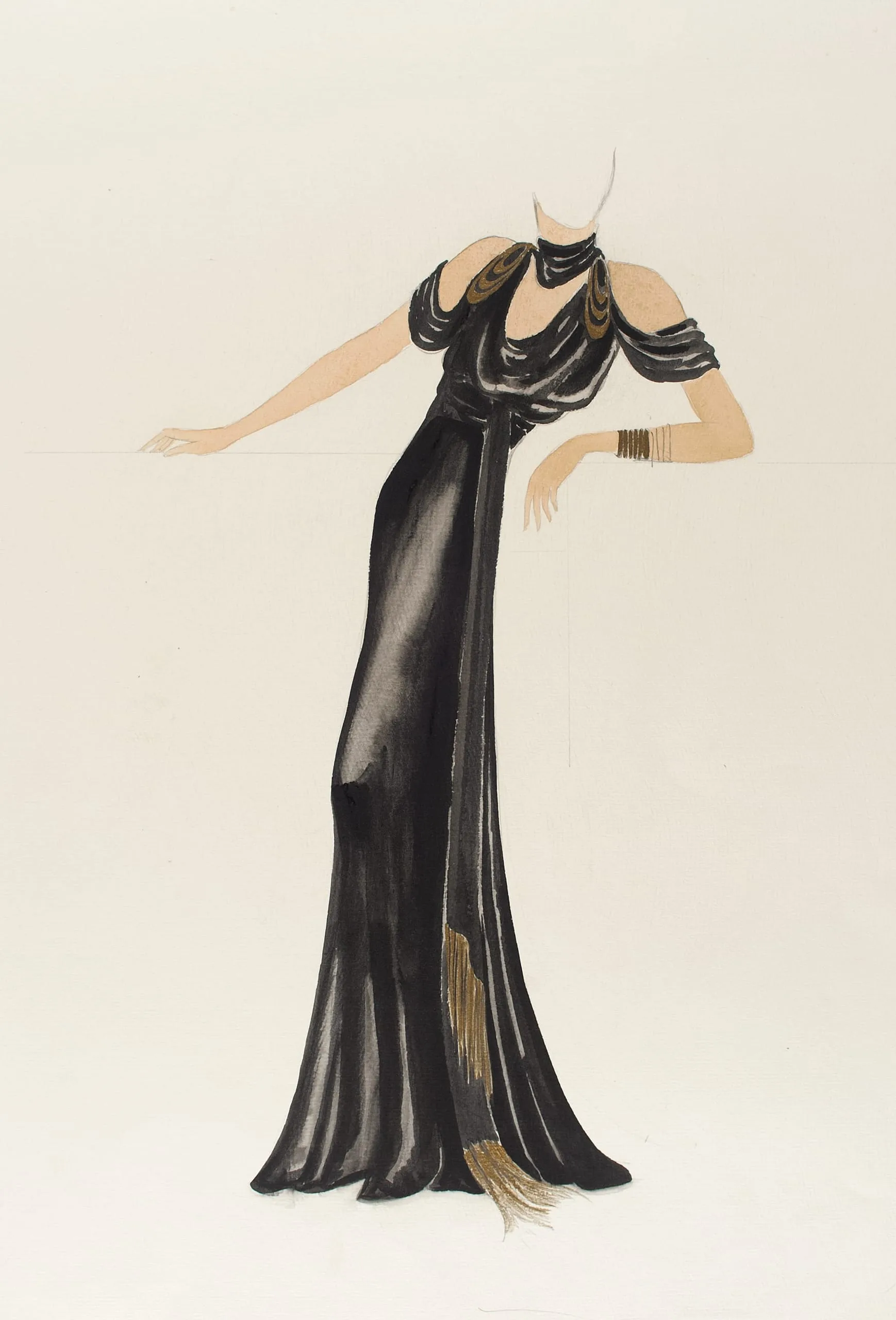 Fashion illustration in black ink and paint with gold accents on cream paper, showing a headless figure in a floor-length black satin gown with off-shoulder draping and gold feather trim at the hem