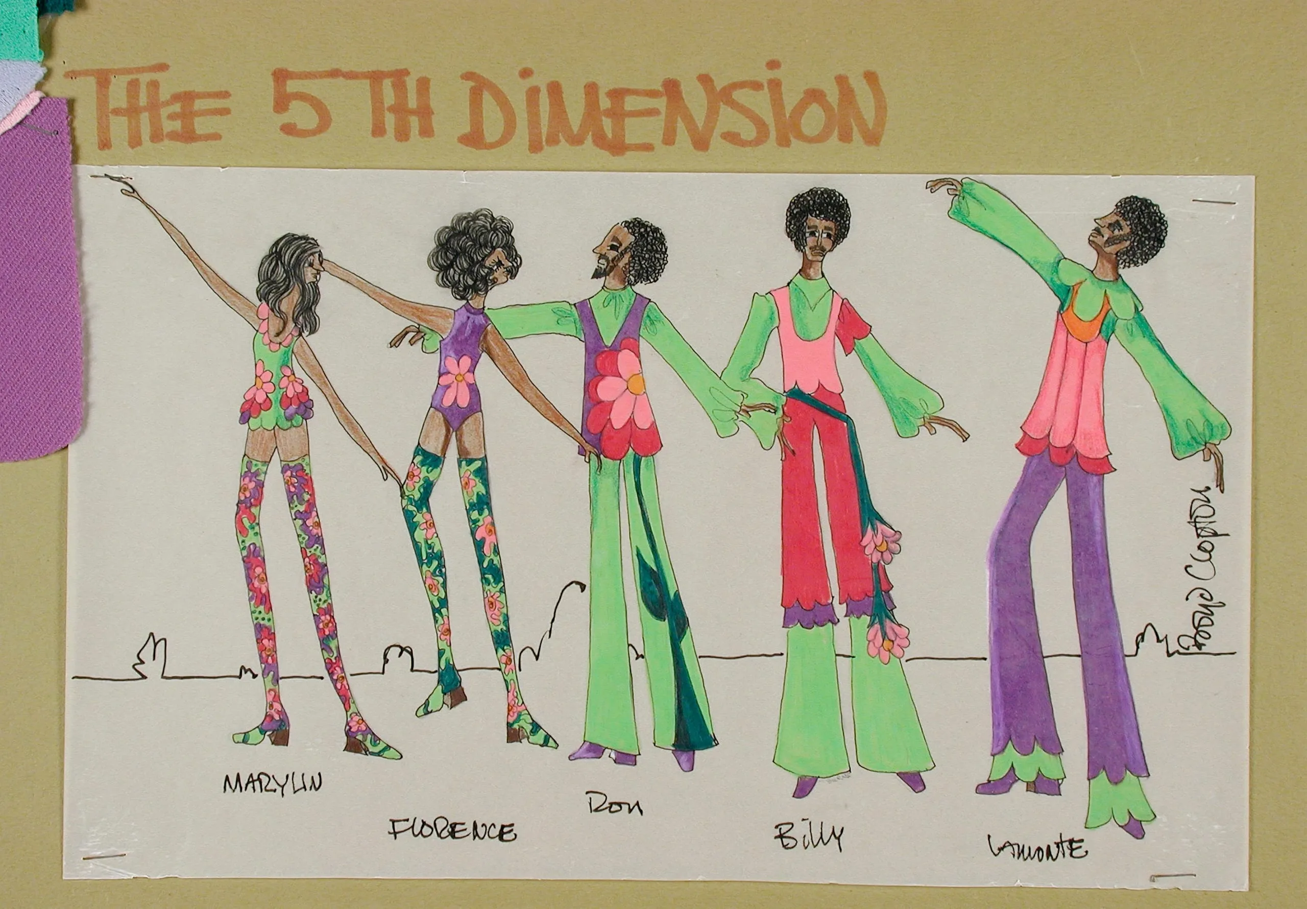 Ink and marker costume design sketch on cream paper showing five figures in brightly colored 1970s-style ensembles, labeled 'The 5th Dimension,' signed Bobbie Clopton