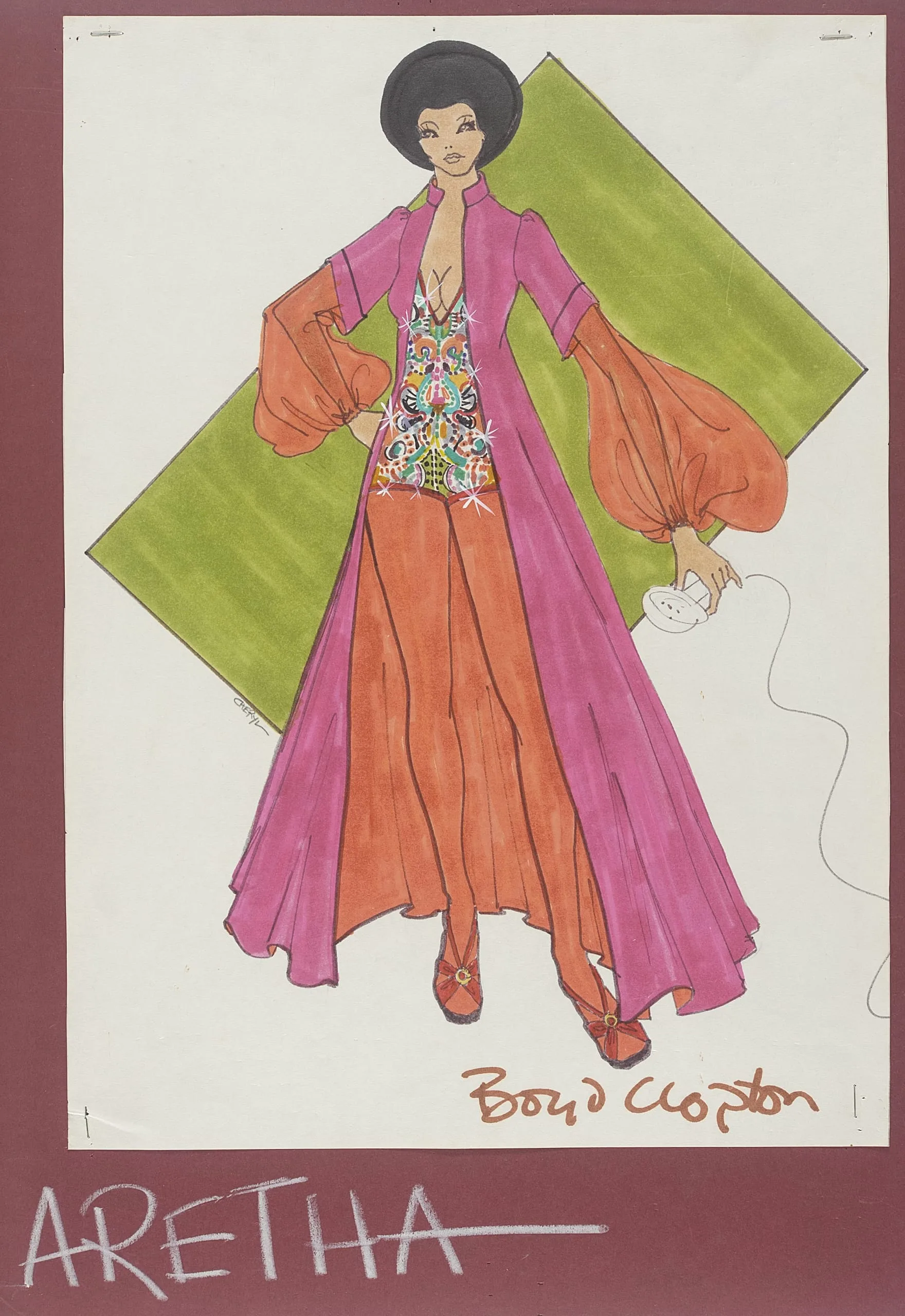 Fashion illustration in ink and watercolor showing a full-length figure in a magenta duster coat over an embroidered top and burnt-orange wide-leg pants, against a chartreuse diamond background; signed 'Boyd Clopton' with 'ARETHA' lettered below