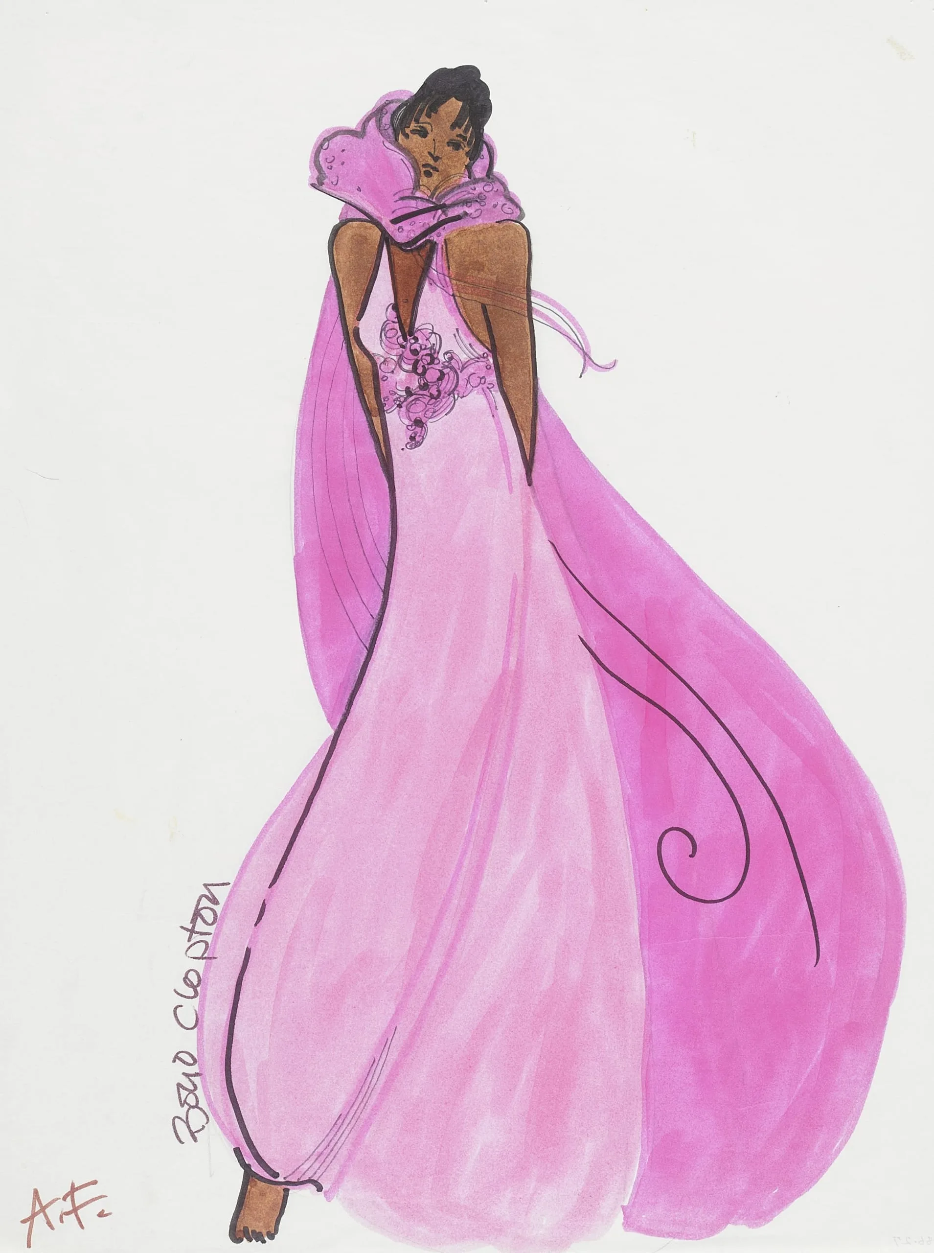 Fashion illustration in ink and wash on white paper, a woman in a pale pink floor-length gown with a magenta cape and oversized collar, shown from behind with face turned in three-quarter profile