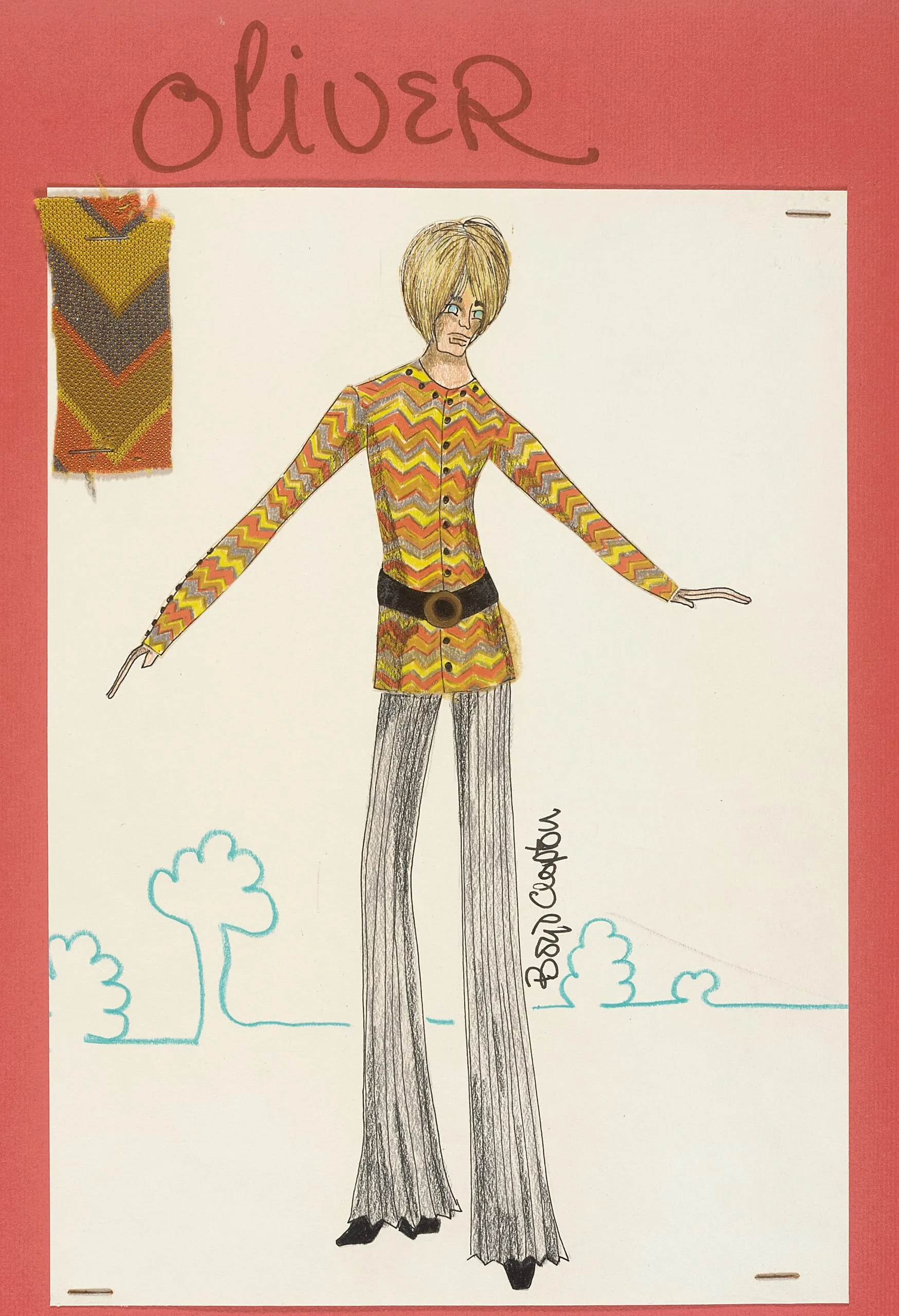 Ink and marker costume design drawing of a standing figure in a chevron-patterned tunic, wide black belt, and dramatically flared gray trousers, with a fabric swatch and hand-lettered title on coral mat board