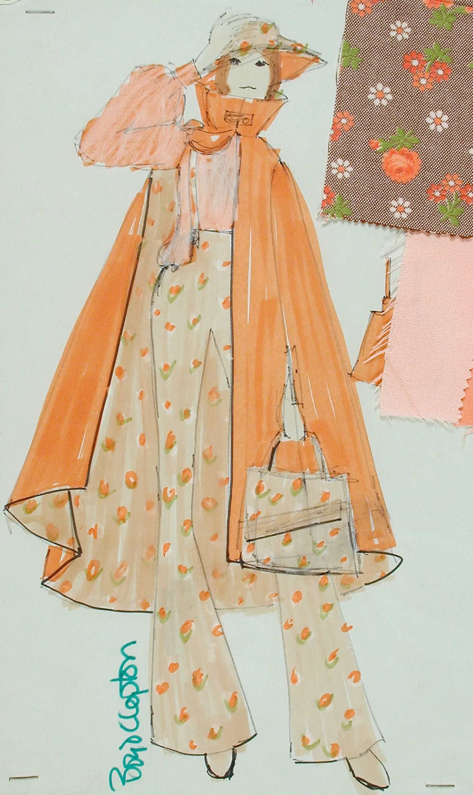 Fashion illustration in ink and marker on pale blue-gray paper, a woman in a sweeping orange cape and floral wide-leg trousers, with fabric swatches attached upper right