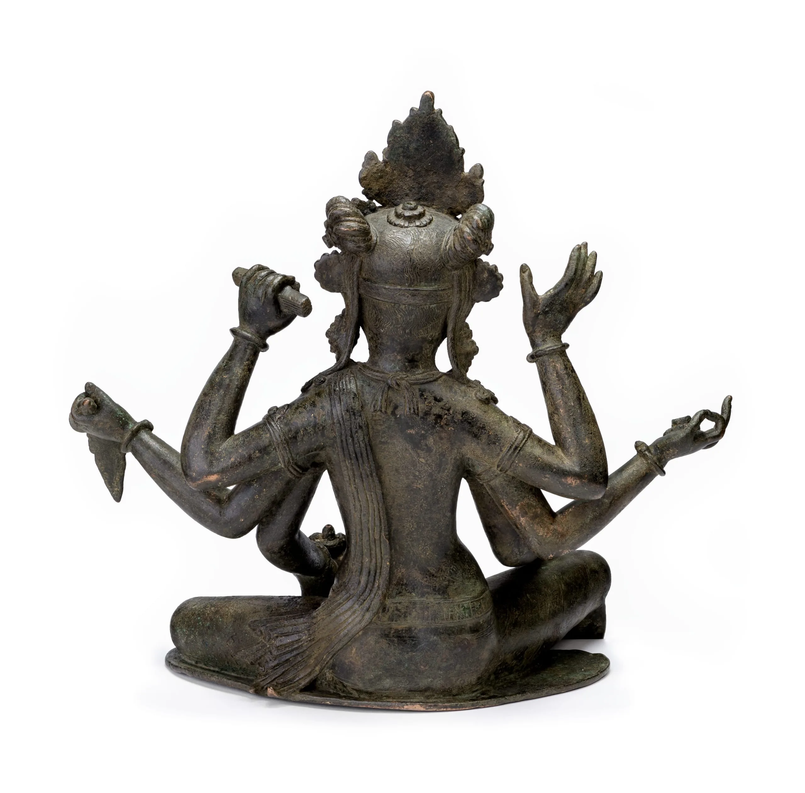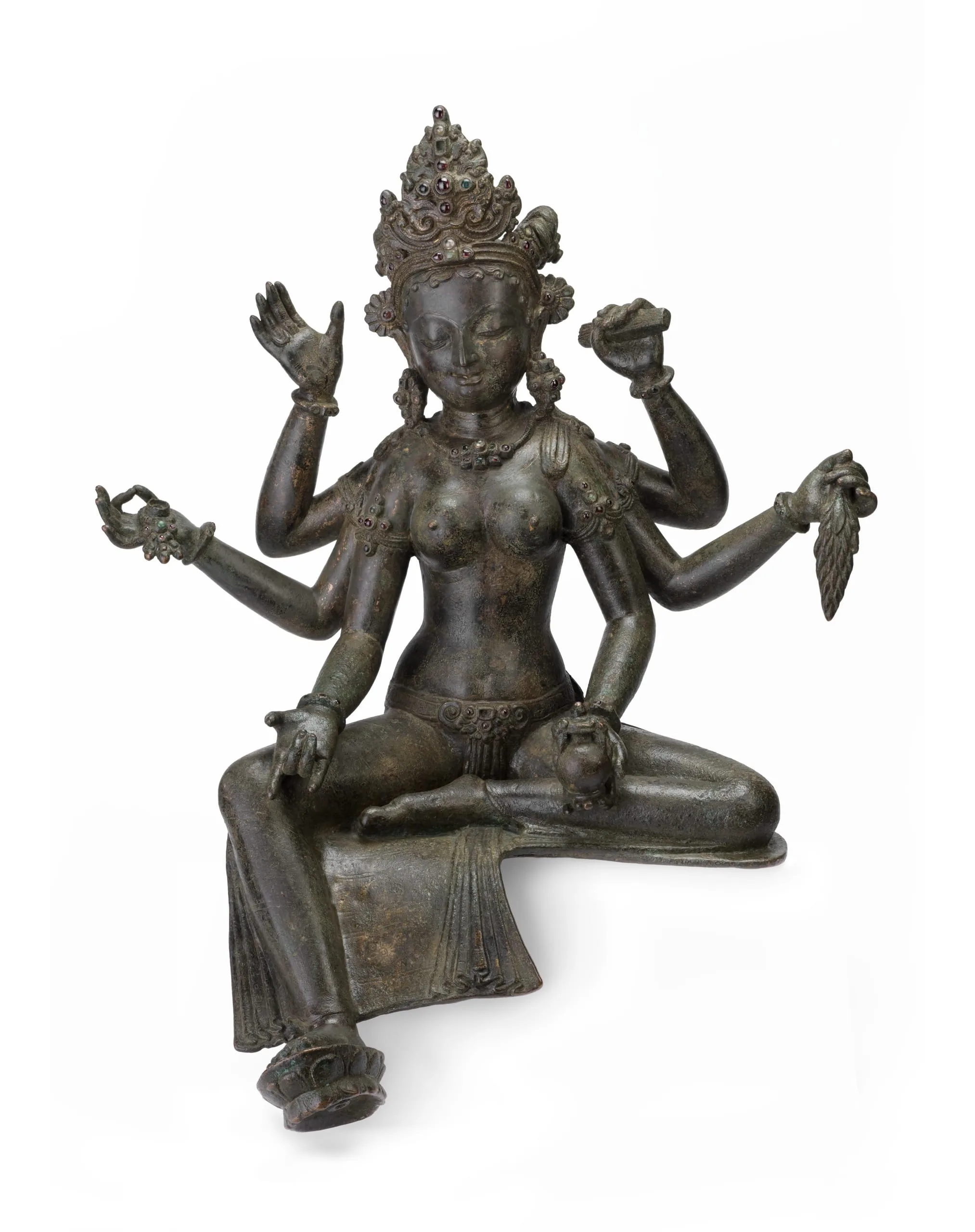 Vasundhara is crowned and wears elegant gem-encrusted jewelry. She sits in a relaxed posture (lalita asana) with her right leg pendant and supported by the pericarp of a lotus flower (karnika). Her lower right hand is held in the gesture of charity (varada mudra). Her middle right hand holds a sheath of jewels (ratna manjari). Her upper right hand is raised with an open-palm gesture that pays homage to the Buddha (tathagata vandana). Her lower left hand holds an auspicious water pot. Her middle left hand holds a sheaf of grain (dhanya manjari). Her upper left hand carries a manuscript of the Prajnaparamita (Perfection of Wisdom). The sacred text and Buddha-adoring gesture demonstrate Vasundhara’s identification with Prajnaparamita, as the “mother of all Buddhas.”