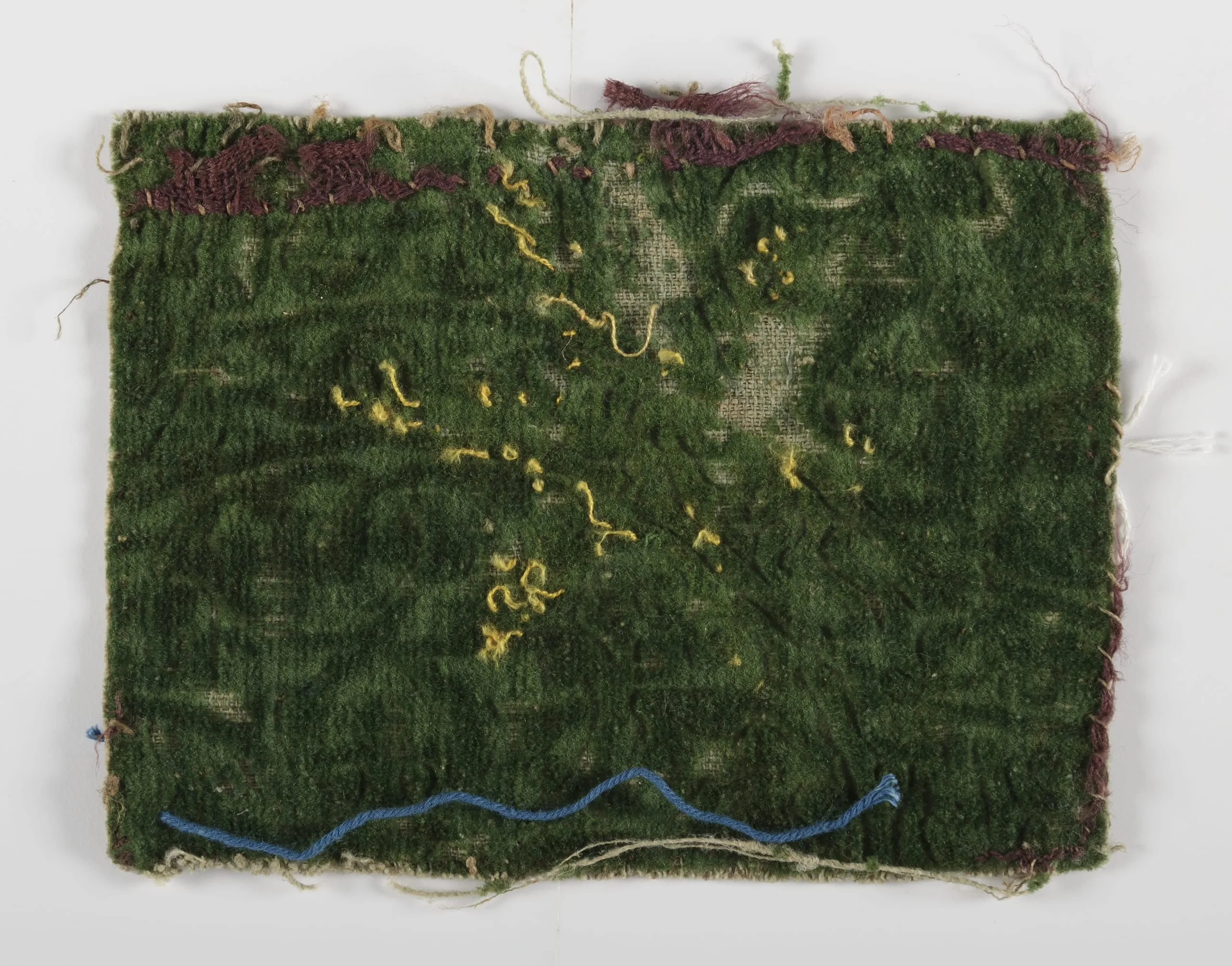Horizontal textile fragment with dense forest-green pile on a plain-weave ground, scattered yellow-green looped threads, and a single wavy blue thread near the bottom edge