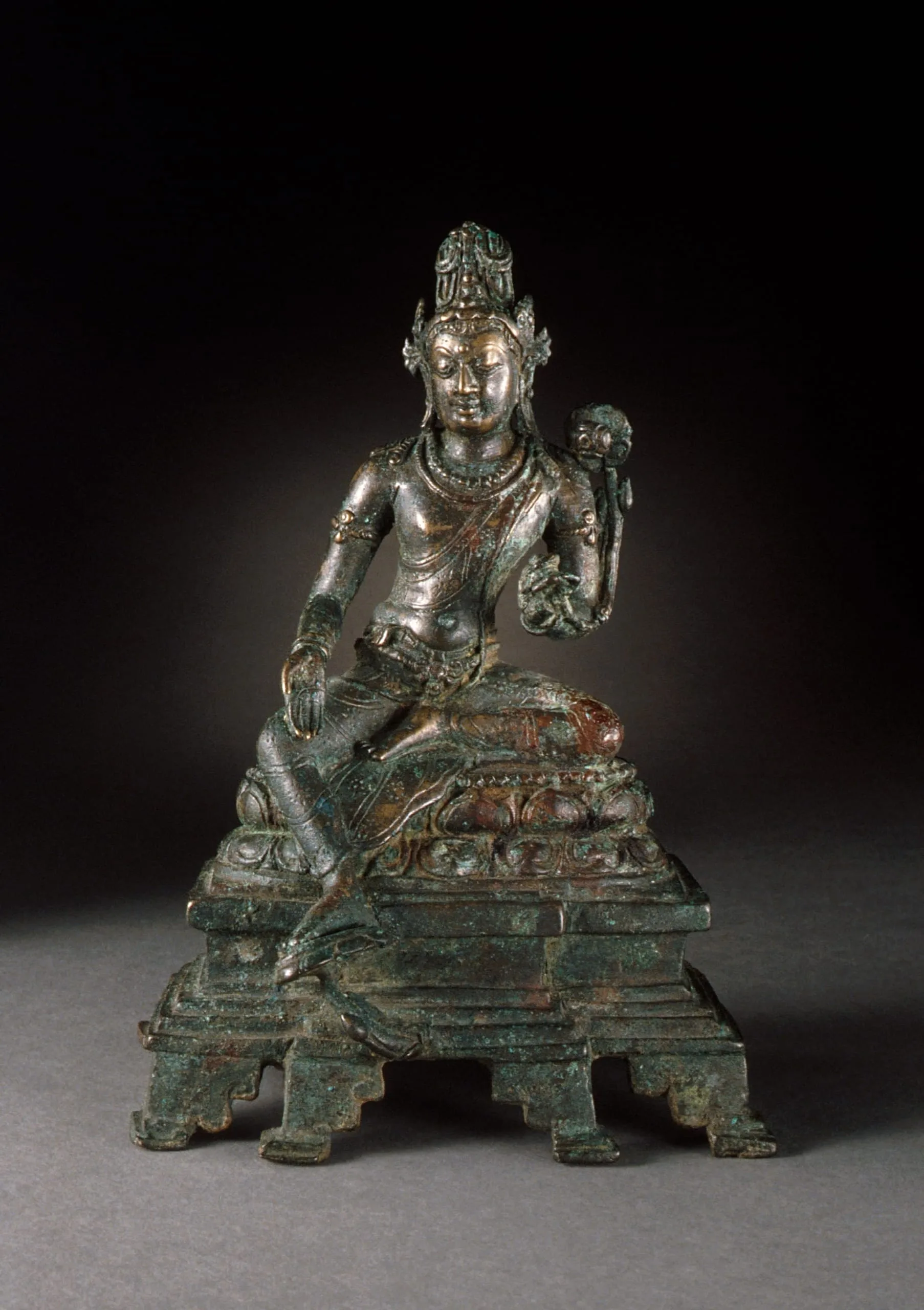 Avalokiteshvara, the Bodhisattva of Compassion, is enthroned on a lotus base on a pedestal. He sits in the relaxed posture (lalita asana) with his right leg pendant and supported by the pericarp of a lotus flower (karnika). He is crowned with a tiara and has the piled hair of an ascetic. His separately cast throneback is now missing. He wears a patterned dhoti and the standard jewelry. His right hand is extended in the gesture of charity (varada mudra). He holds a lotus in his left hand.