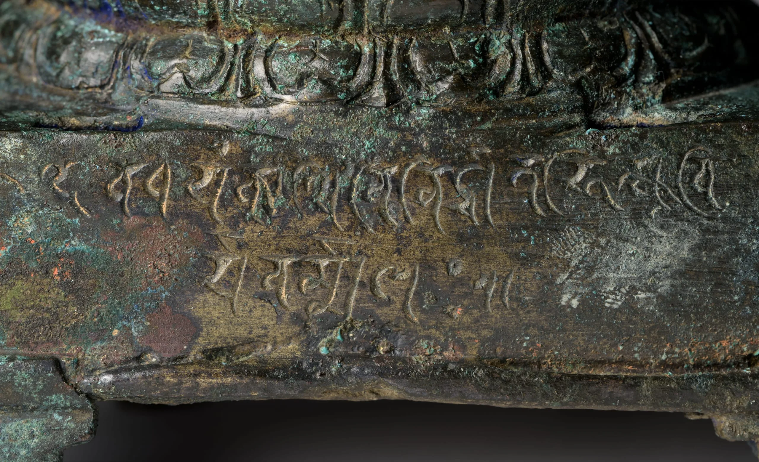 The sculpture was likely donated to the Apanaka Monastery in pilgrimage center of Kurkihar, Bihar. An inscription on the rear of the base reads, This is the pious gift of the monk Viryavarman, who is from Kanchi [Kanchipuram, Tamil Nadu]. (Translation by Pratapaditya Pal.)